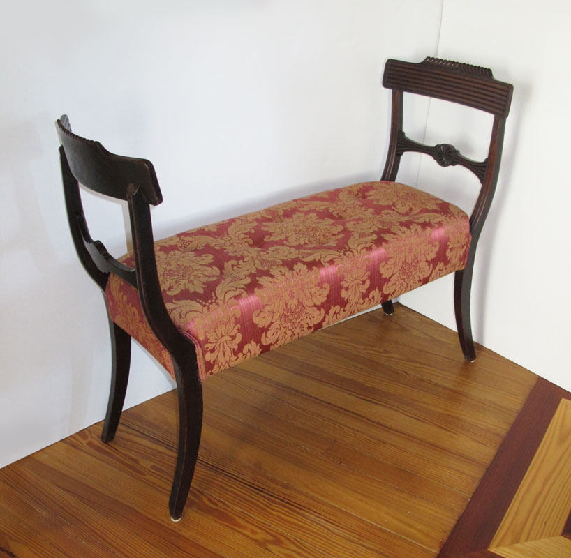 MAHOGANY CHAIR BENCH: A unique bench which appears to be constructed from 2 chair backs with tufted floral upholstery. Measures 34'' h. x 42 3/4'' x 17''.