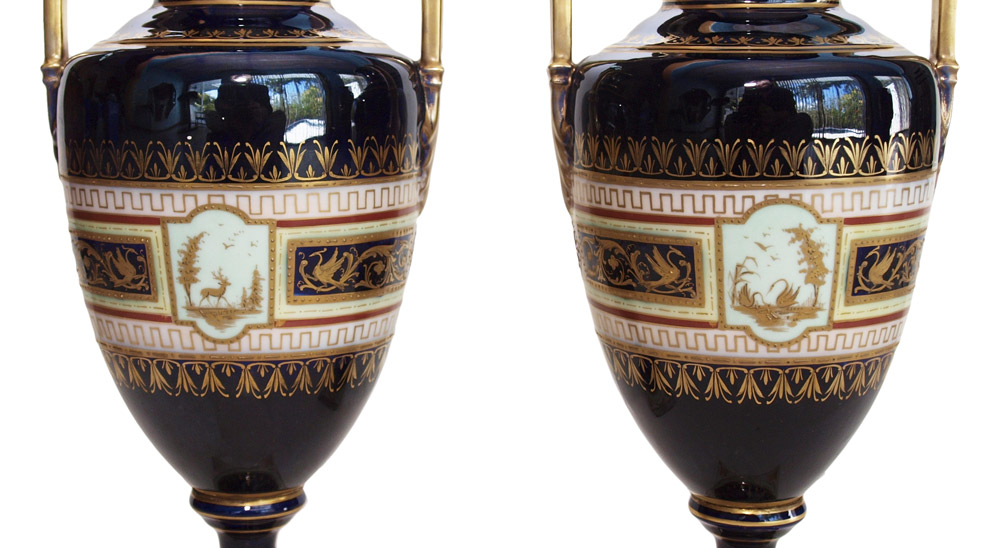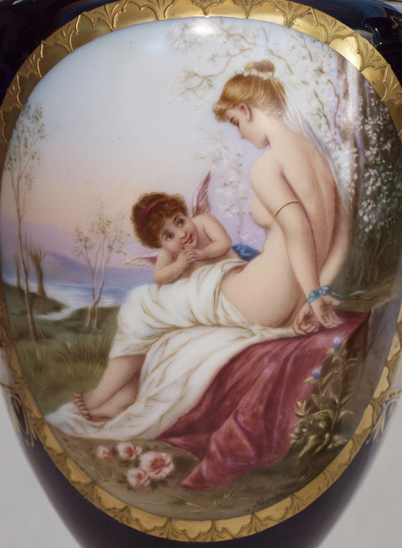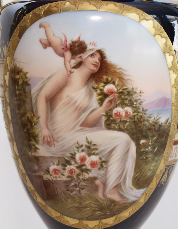 PAIR ARTIST SIGNED ROYAL VIENNA PORCELAIN VASES: Cobalt ground rich in gold decoration, each with a painted image of Cupid and maiden. One is signed Revier, the other Gelli. 11'' tall.