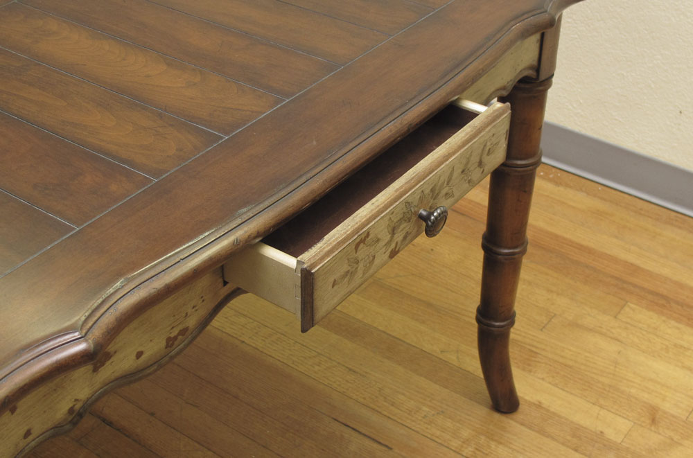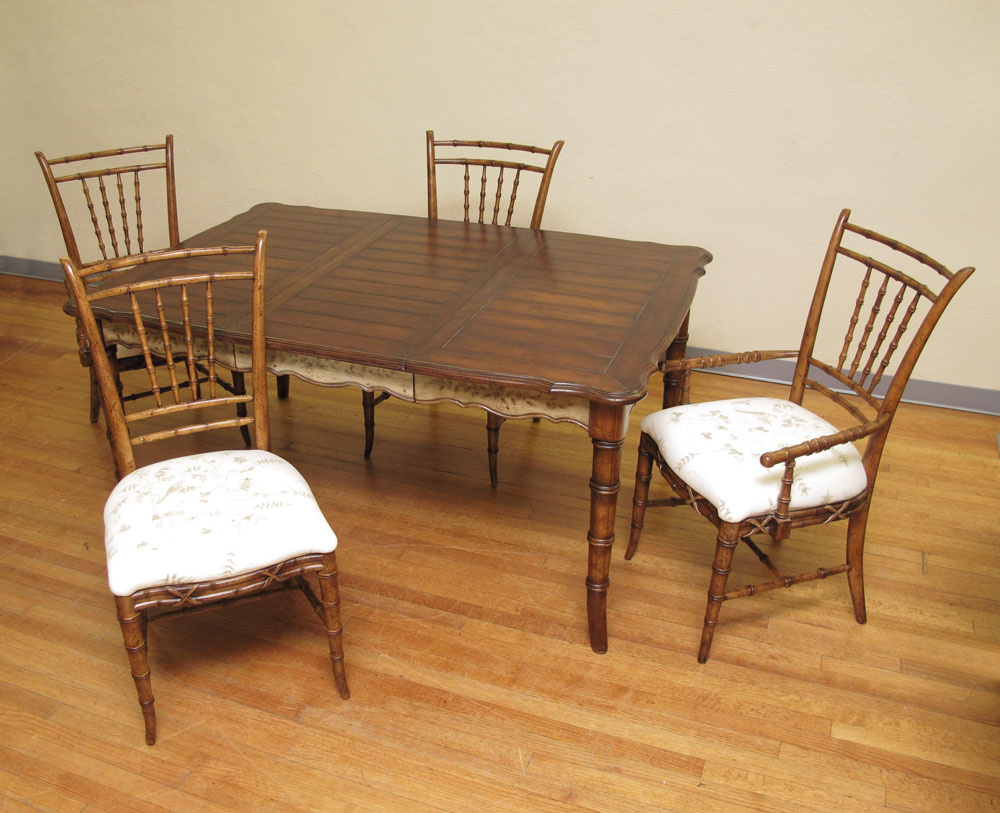 DINING TABLE AND 4 BAMBOO TYPE CHAIRS: Faux paneled top table with paint decorated skirt and shaped bamboo form legs. Single leaf. 2 arm chairs, 2 side chairs with matching bamboo motif. Arm chairs measure 40'' h. x 22'' x 23''.