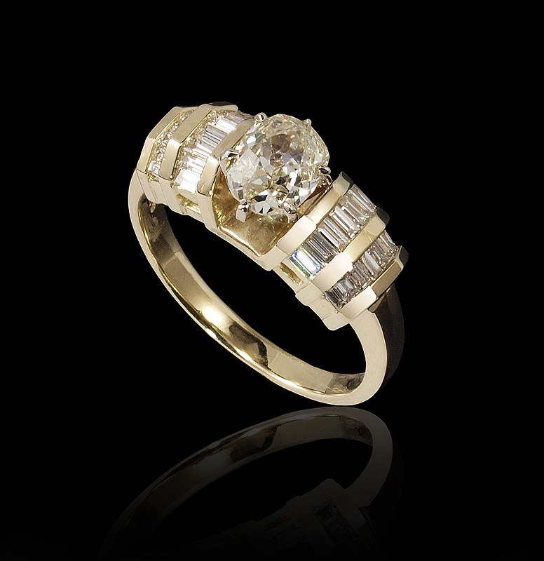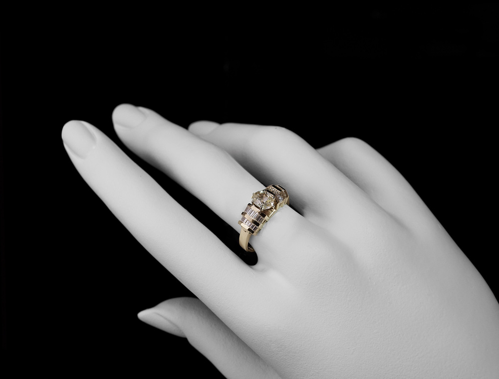 1.49 CTW DIAMOND ENGAGEMENT OR RIGHT HAND RING: 14k yellow gold ring centers an antique cushion cut diamond, approx. .74 Ct., rated VS2 in clarity and O-P color. An additional 28 baguette diamonds total VS in clarity and H-I color. Size 6.5. Weight 4.7 gram. Sold with current Florida Diamond Appraisers GIA graduates appraisal for #3,500.