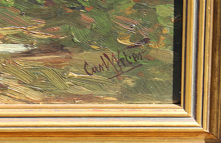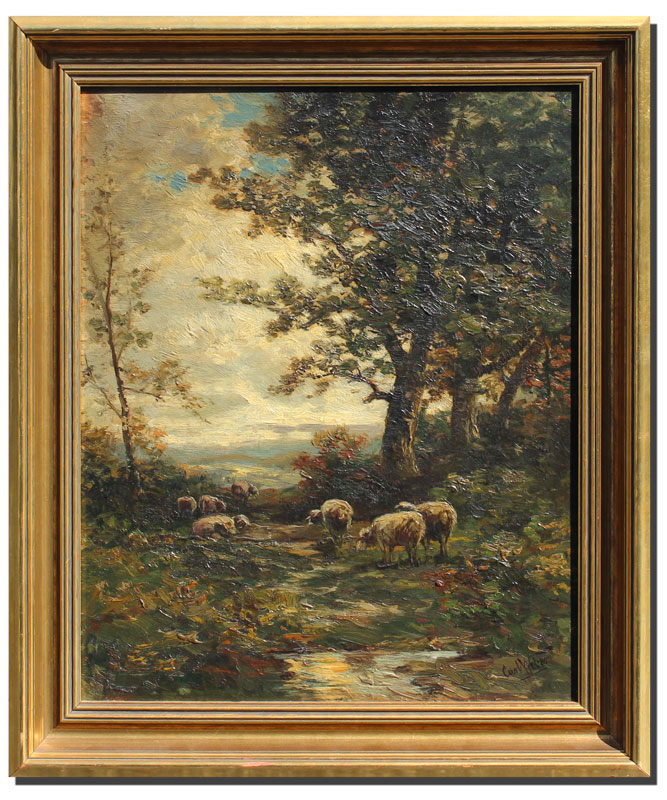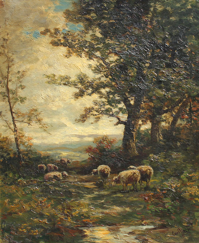 WEBER, Carl Philip, (American, 1850-1921): Sheep in a forest clearing at dusk, OIL/Panel, 18'' x 14 1/2'', signed lower right, contemporary gilded frame, 21 1/2'' x 18 1/2''