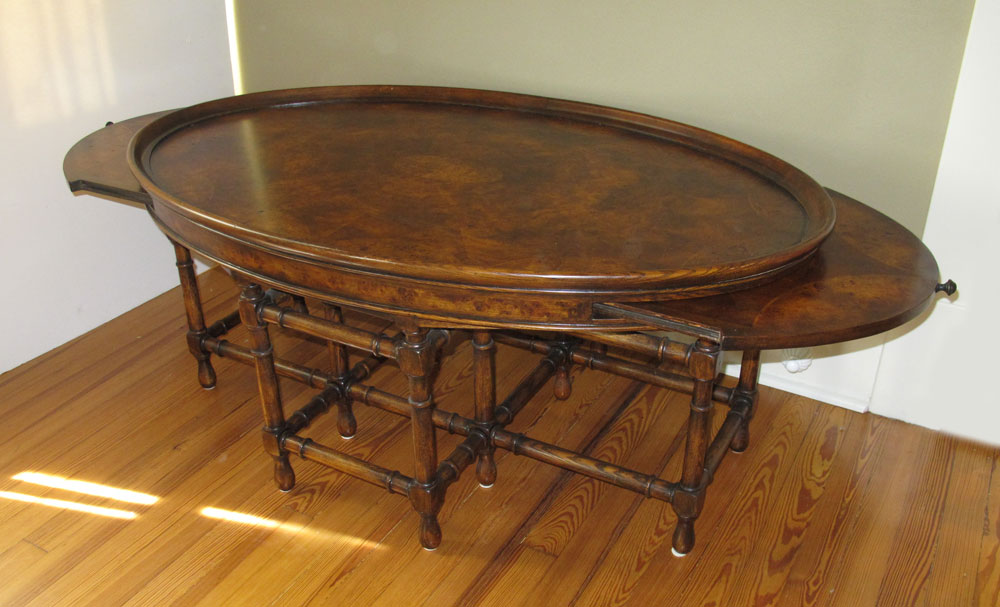 ROBB & STUCKY INLAID DRAW LEAF COFFEE TABLE: Oval coffee table with burl inlay, 2 draw leafs with burl inlay. 12 turned legs and stretchers. Measures 20 1/2'' x 48'' x 30''. Expands to 74 1/4''.