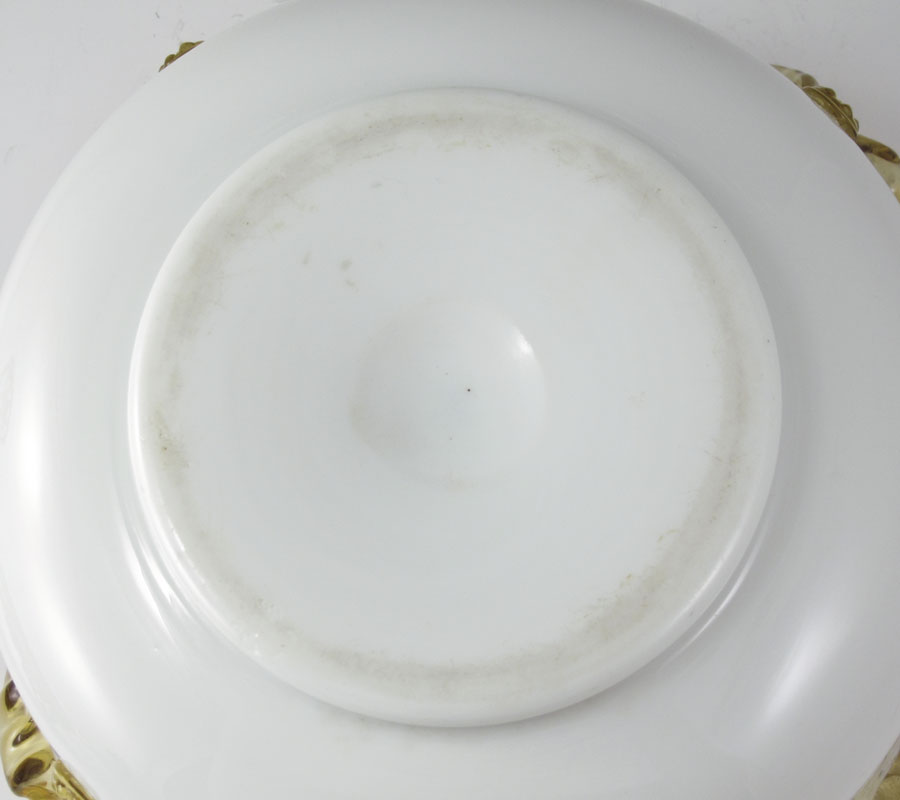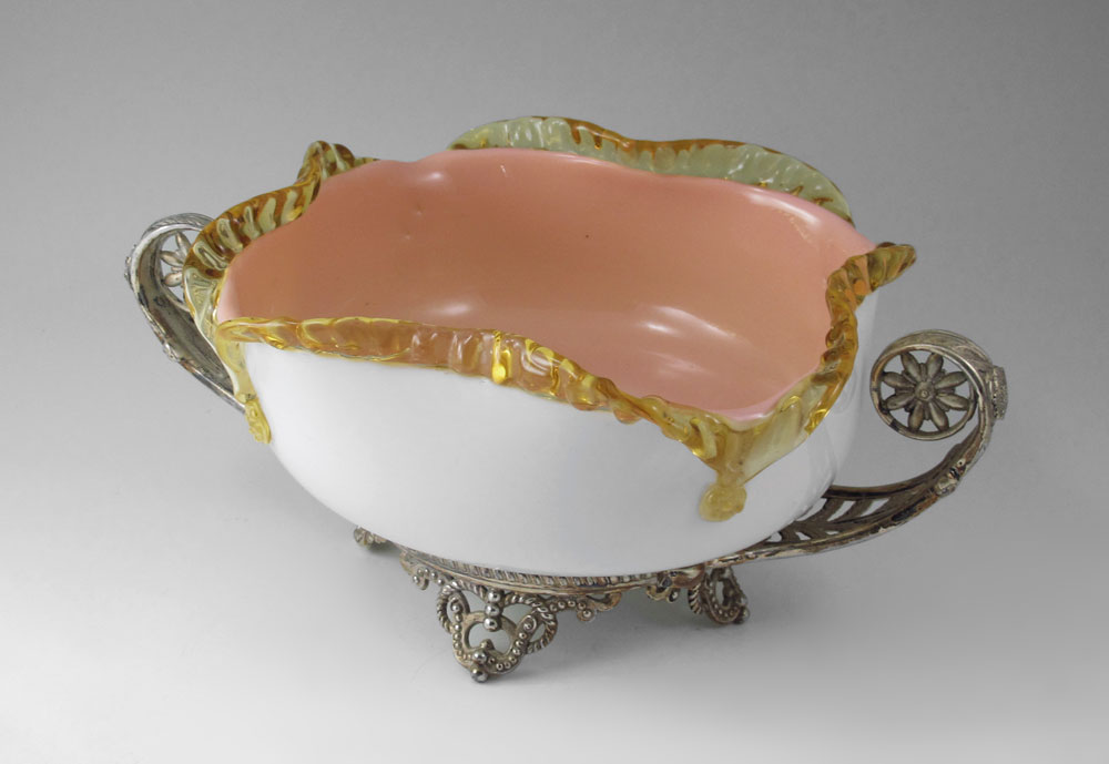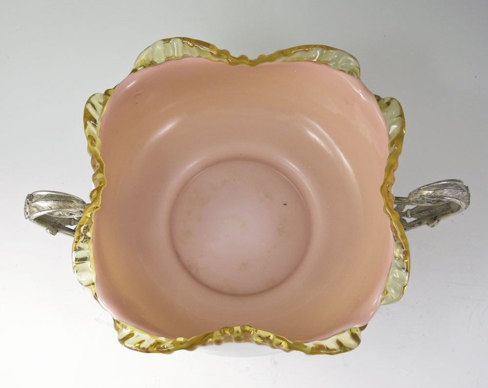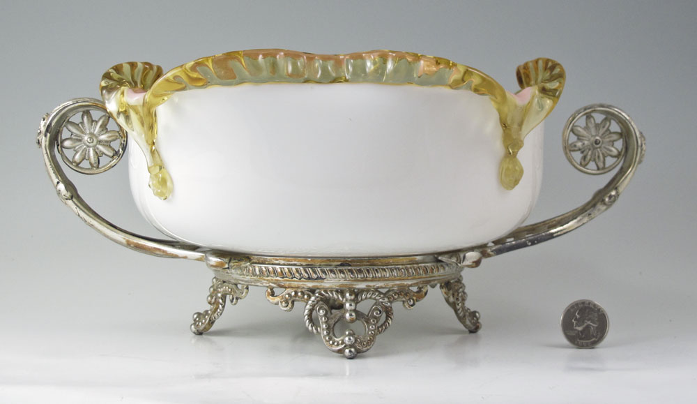 VICTORIAN ART GLASS BRIDES BASKET: Peach glass with applied amber rim, 10'' dia. The silverplate stand is attributed to Pairpoint, measures 12 1/2''w. overall.