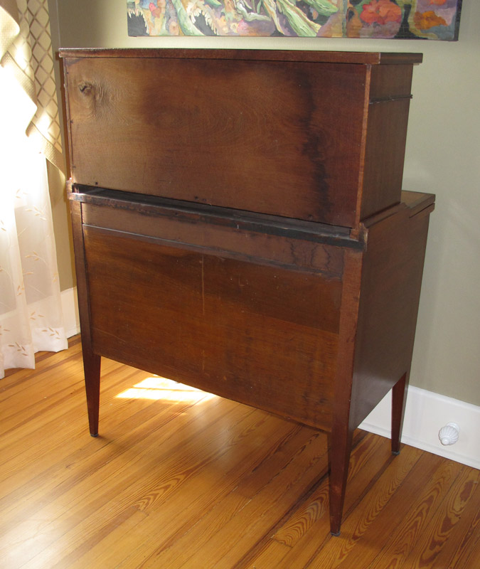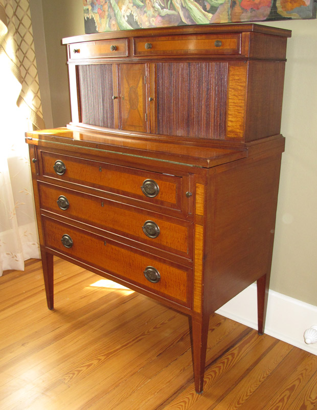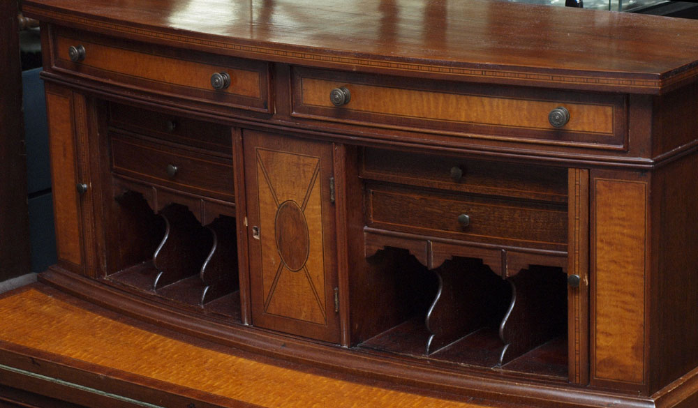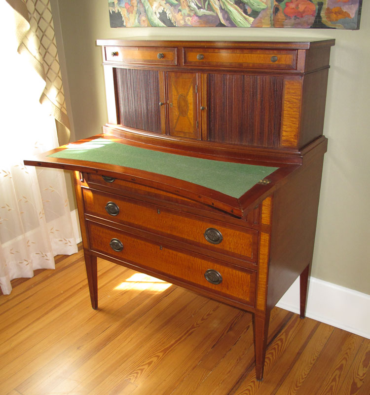 19TH CENTURY SWELL FRONT TAMBOUR DOOR SECRETARY: Mahogany with birds eye maple veneer and kingwood inlay. 2 drawers over 2 tambour doors with central door, hinged writing shelf with felt interior surface. Over 3 drawers on tapered legs. 46 1/4'' h. x 35'' x 19''