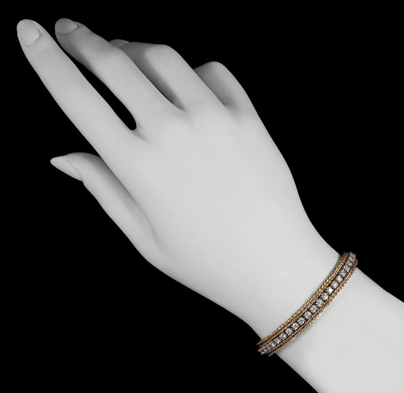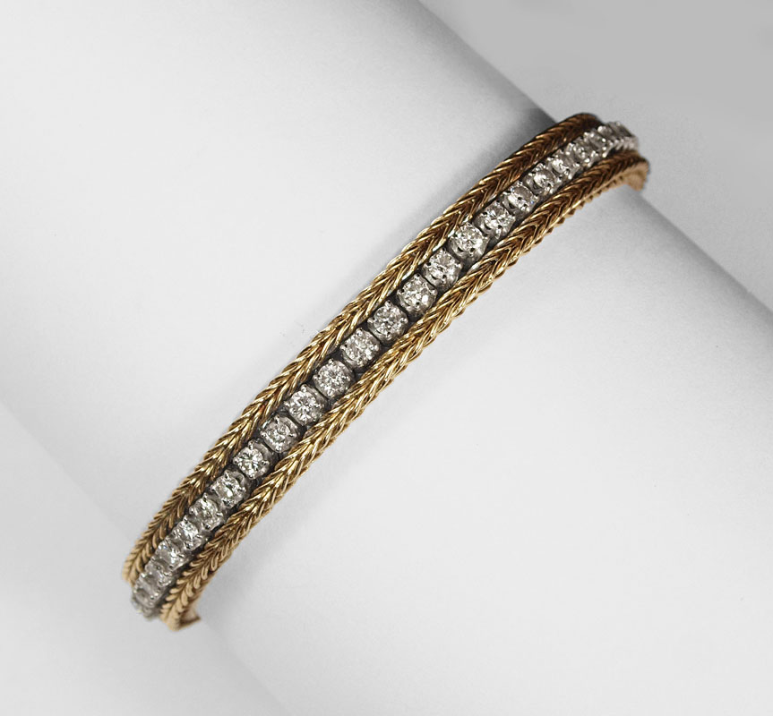 3.00 CTW DIAMOND LINE BRACELET: 14K yellow and white gold bracelet contains 56 round brilliant cut diamonds. Weight: 3.00 Ct. Approx. The diamonds average VS in clarity and H-I in color. The diamonds are prong set. Locking closure with hidden hinged safety claps and safety chain. Length 7''. Weight: 25.3 grams.
