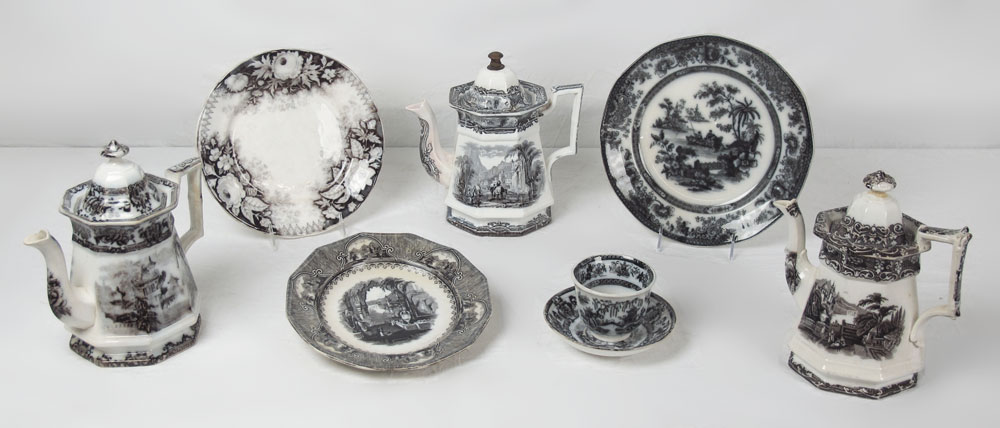AN ASSEMBLED COLLECTION OF MULBERRY TRANSFER WARE: 8 pieces to include 3 teapots, 3 plates, cup and saucer from assorted makers to include Genoa, Villory & Bach, Heath and more. Largest teapot measures 9 1/4'' h. x 9''.