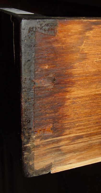EARLY VICTORIAN STEP BACK BOOKCASE CUPBOARD: Mahogany veneer, 2 glass door with painted white interior with 3 shelves, over 2 quarter length drawers and central drawers. Base with full length drawer over 2 doors, single shelf. Early owner identification as George Hewett Peters, Newark NJ, 1852. Measures 88 3/4'' h. x 47'' x 22 1/2''.