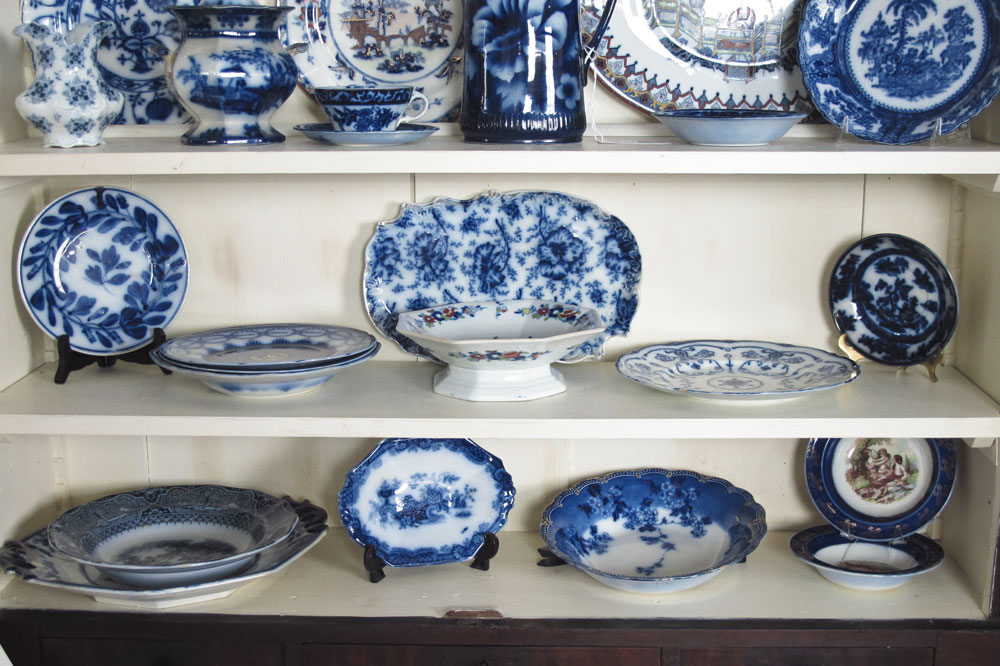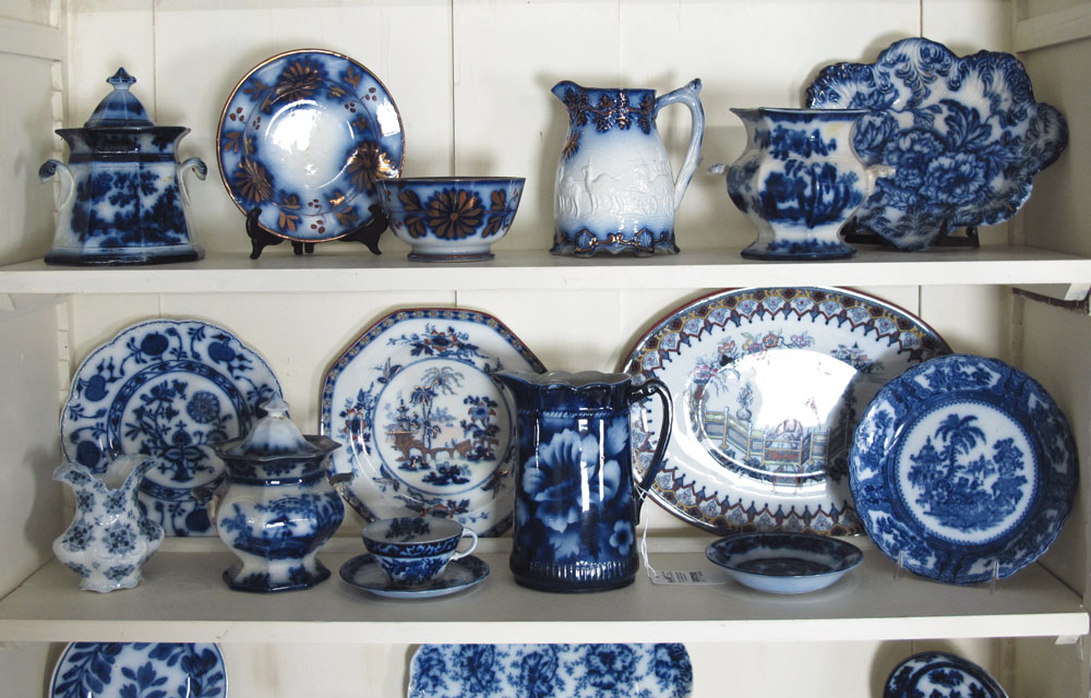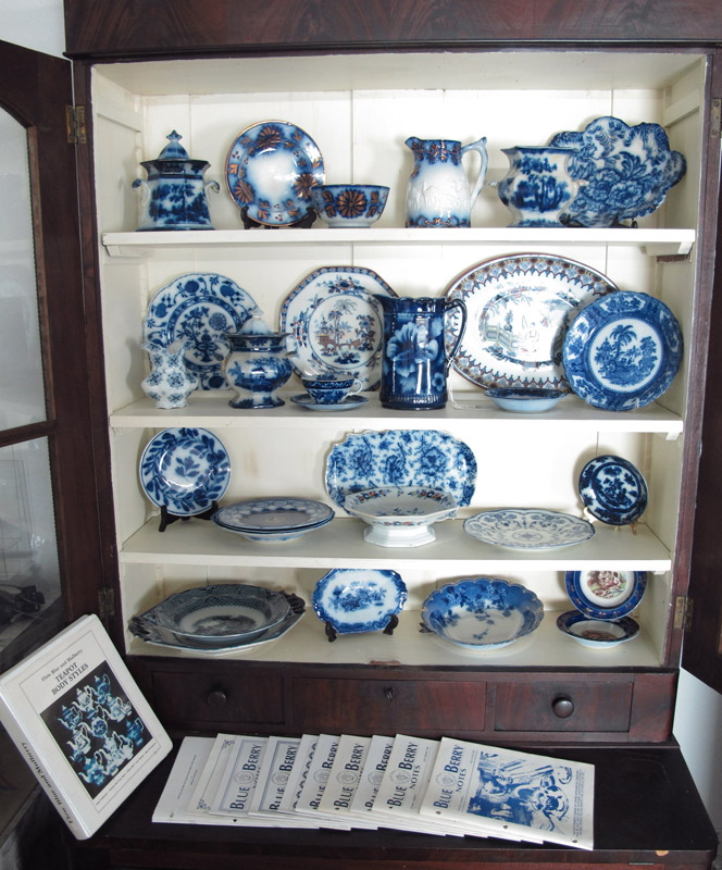 AN ASSEMBLED COLLECTION OF FLOW BLUE CHINA: Approx. 30 pieces to include pitchers, covered jars, chargers, plates and bowls. In assorted motifs including Oriental, French and English. Sold with 7 copies of Blue Berry notes.