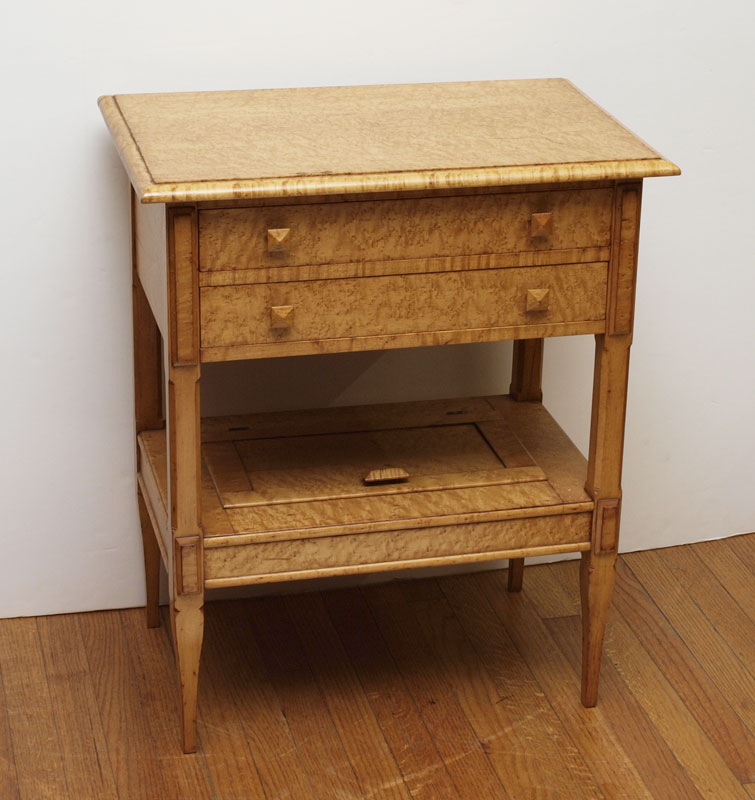 TIGER MAPLE TWO DRAWER WORK STAND: Bench made two drawer stand with lower tier having lift top storage. 29'' tall x 24'' x 16''.