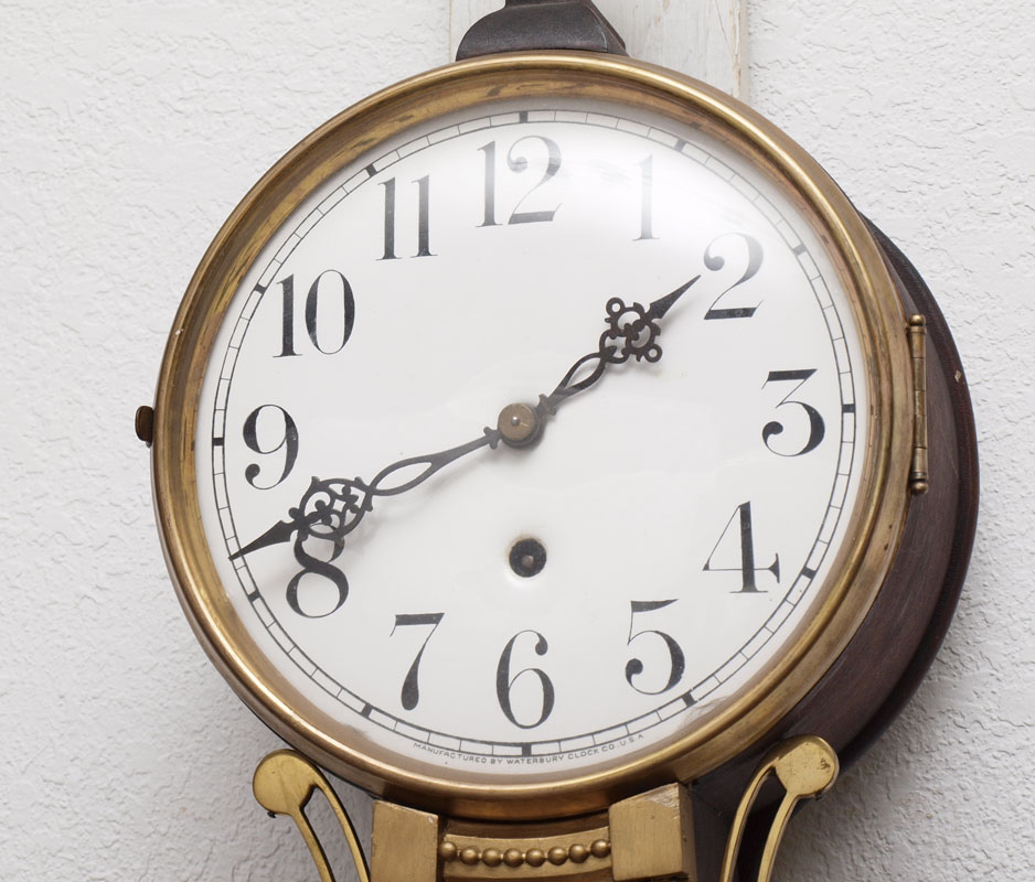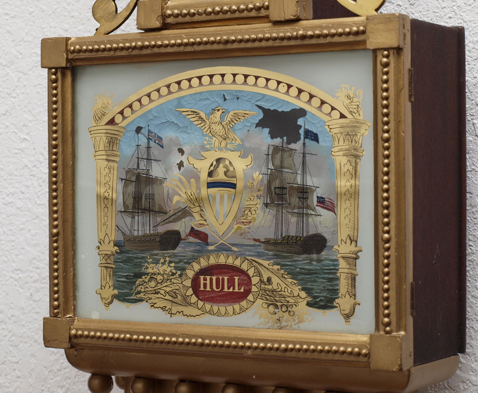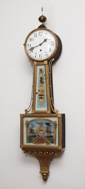 EARLY 20TH CENTURY WATERBURY NAVAL SCENE BANJO CLOCK: Mahogany case with brass spire finial over 8'' dia. porcelain face with Arabic numerals. Foliate scroll with eagle over shield reverse painted center glass, naval battle scene with eagle over shield and ''Hull''. Brass gallery on sides. Overall measures 43 1/2'' h. x 10 1/4'' x 4 1/2''.