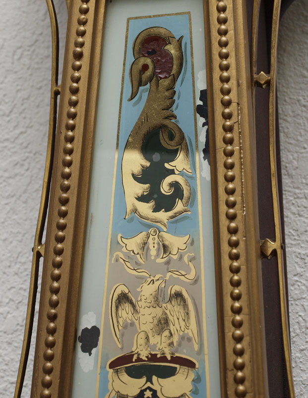 CONDITION: Note chips to dial, loss of paint and craquelure on center and lower glass, early nail repair under to hold door in place, chips an loss of paint on case.