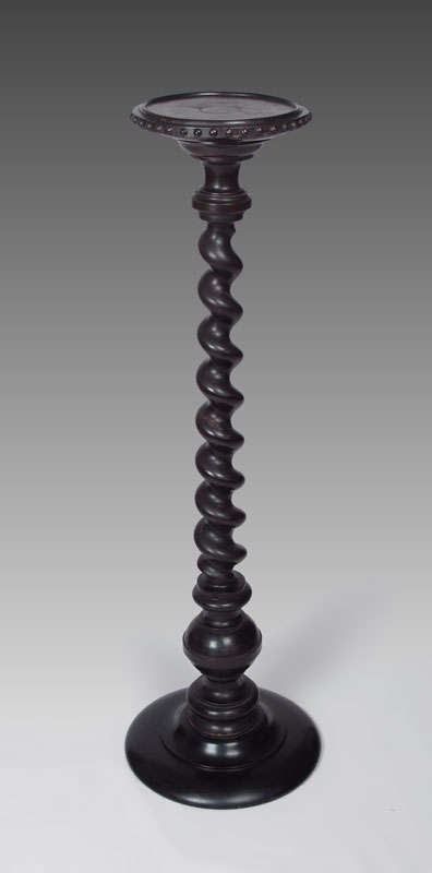 GEORGIAN EBONIZED BARLEY TWIST PEDESTAL: Top with beaded wood rim, barley twist body. Ebonized finish. 48 1/2'' h. x 15 1/2'' dia.