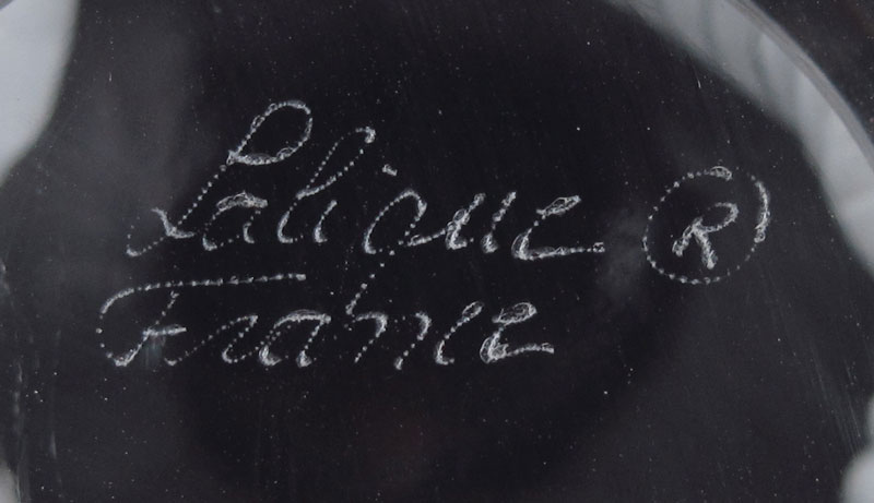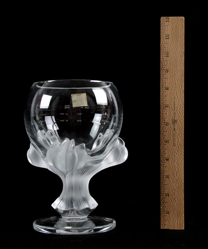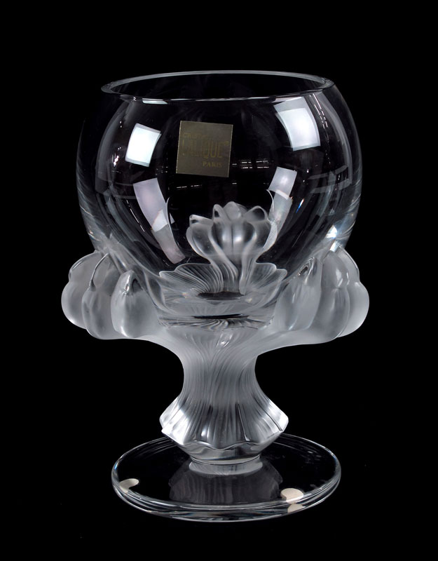 LALIQUE FRENCH CRYSTAL ''BAGHEERA'' LION PAW VASE: Frosted paws under the clear bowl vase, signed in script and paper label. Approx. 8 1/2'' tall, the base 6'' dia.
