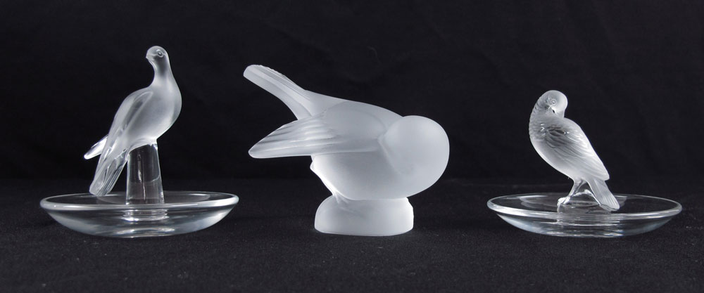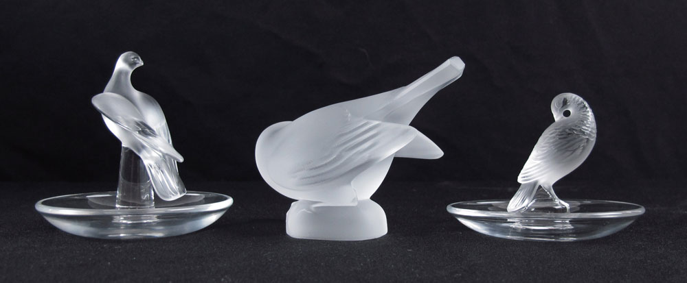 LALIQUE CRYSTAL SPARROW AND 2 RING HOLDERS: To include 1) Sparrow, etched signature, 3 1/4'' h. x 4 1/4'' x 2 7/8''. 2) Dove ring holder, etched signature, 3 1/2'' h. x 3 3/4'' dia. 3) Goose ring holder, etched signature, 2 3/4'' h. x 3 5/8'' dia.