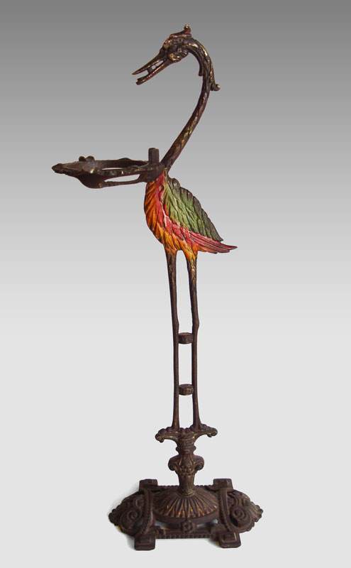SANDEL FIGURAL HERON CAST IRON FLOOR ASHTRAY: Polychrome figural floor ashtray with heron form. Marked Sandel Mfg. Co. S227 Pat. App. For on base. No insert. Measures 36'' h. x 13'' x 8 3/4''.
