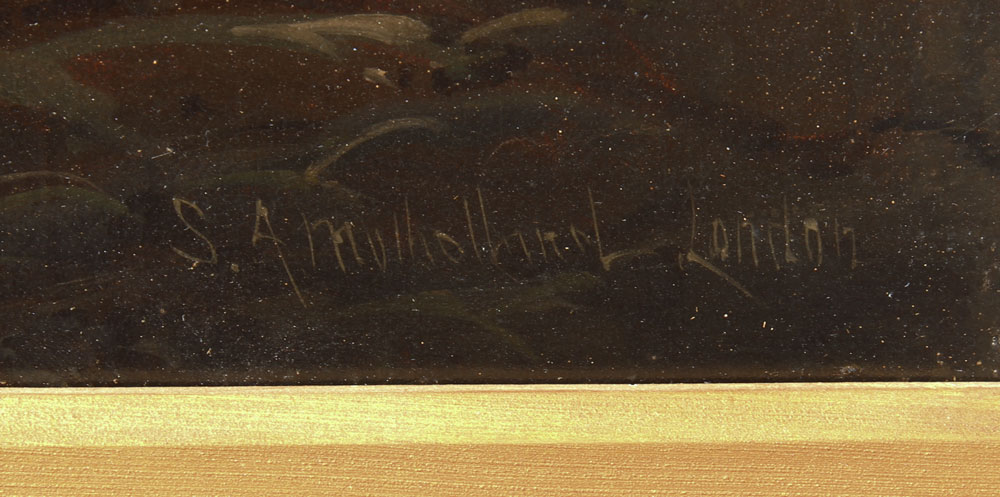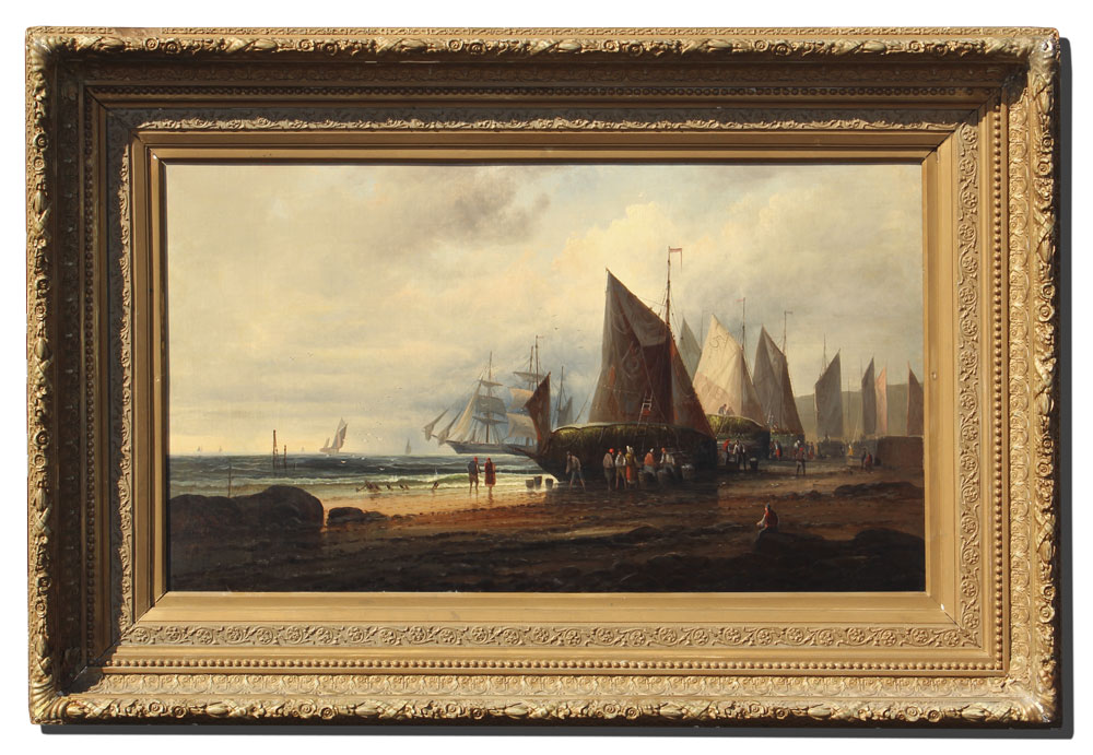 MULHOLLAND, S.A.,(English, 19th century): Boats and Figures on the Shore, OIL/Canvas, 24'' x 42'', signed lower right S.A. Mulholland London, original gilded gesso frame with wear, 38'' x 56 1/2''.