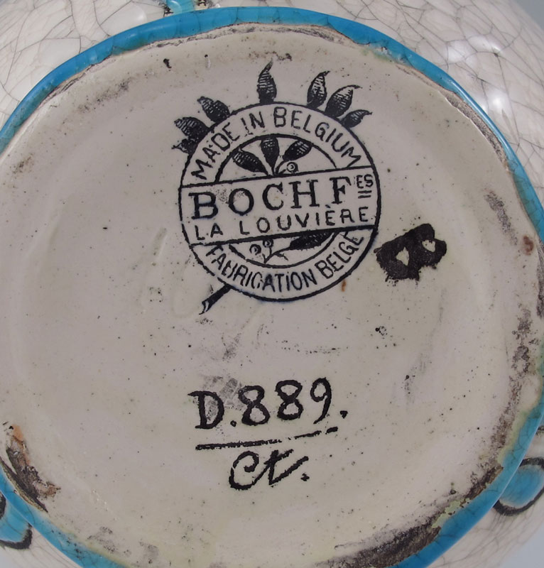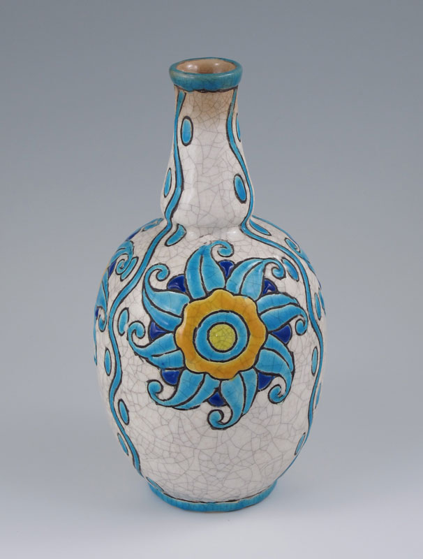 BELGIAN ART DECO BOCH FRERES ENAMELED POTTERY VASE CA. 1920'S: Enamel pattern on crackle glaze ground. Black inkstamp mark, design number D889, initials CT. 8.5'' tall.
