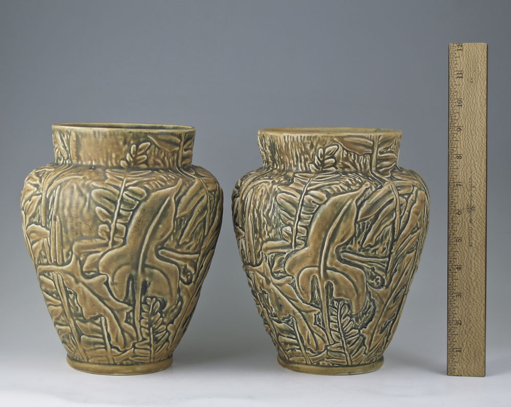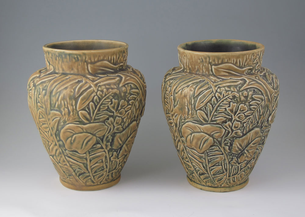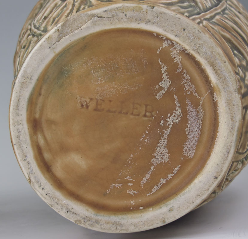 PAIR OF WELLER MARVO POTTERY VASES: 2 baluster form vase in the Marvo pattern by Weller. Impressed Weller stamp on one. Each measures 9'' h. x 7''.