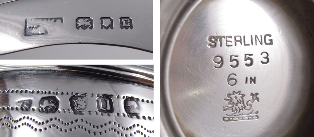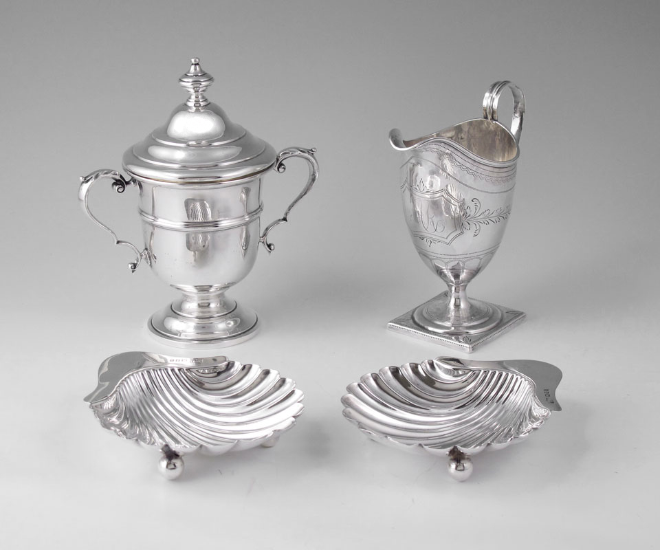 4 PIECE ESTATE COLLECTION OF STERLING SILVER: To include 1) 1815 London hand chased creamer with engraved decoration, monogrammed AR. Illegible makers hallmark, 5 1/8'' h. x 4 1/2''. 2) Redlich covered sugar, 6'' h. overall x 5 1/4''. 3) Pair of shell form nut dishes on ball feet with spurious English hallmarks. Sold as marked. 4 7/8'' l. Approx. 16.3 troy oz.
