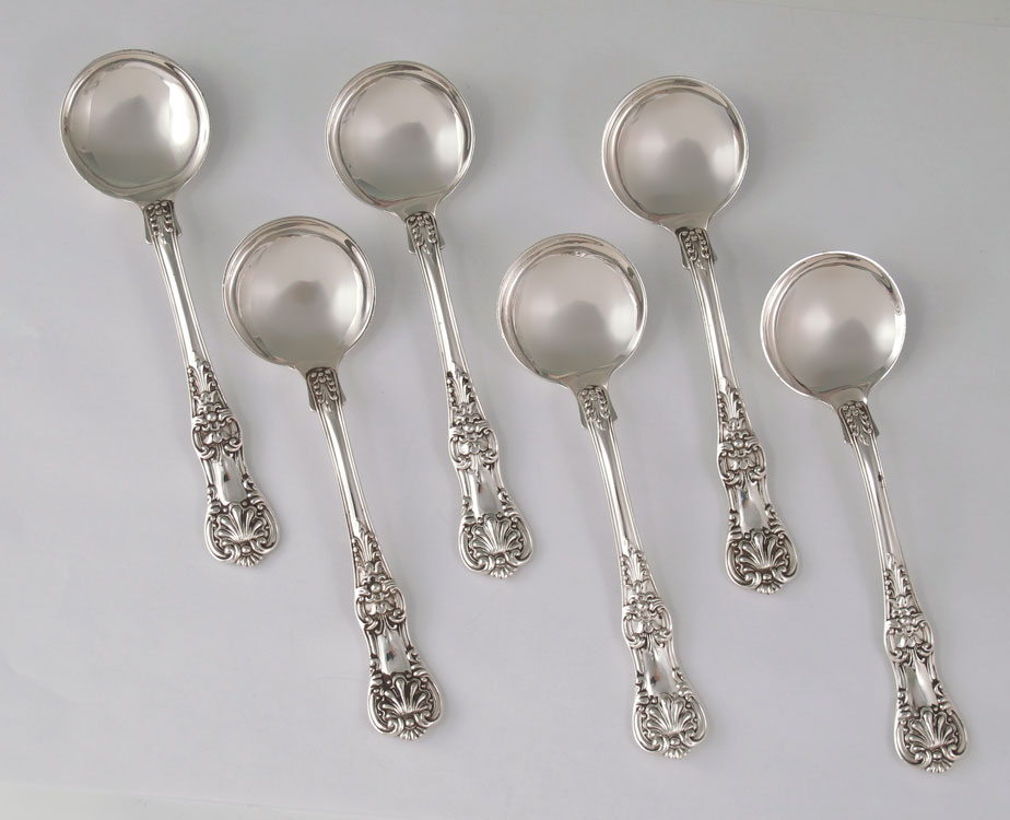6 TIFFANY & CO. ENGLISH KING STERLING SOUP SPOONS: Set of 6 sterling soup spoons in the English King pattern by Tiffany & Co., 5 1/4'' l. Marked Tiffany & Co. with M. Approx. 7.1 troy oz.