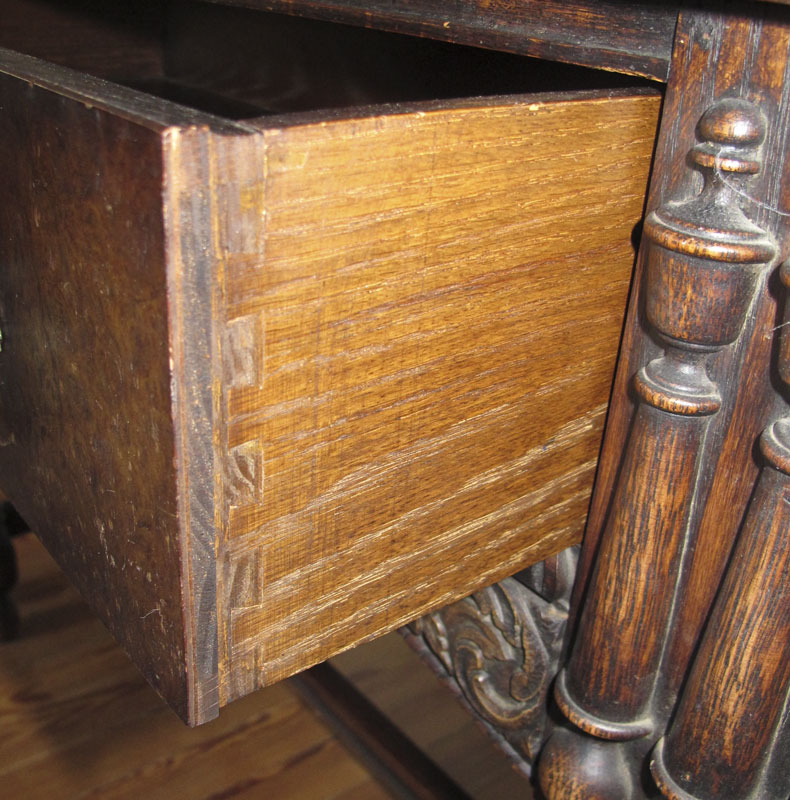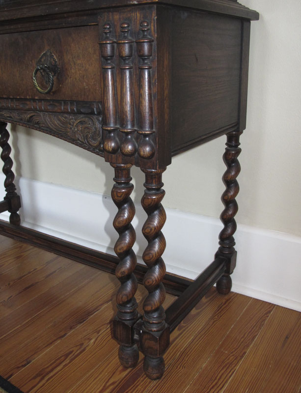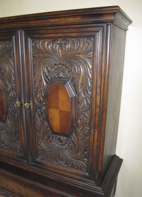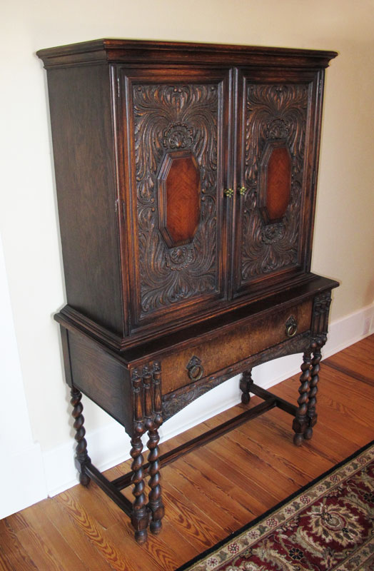 1930'S CARVED OAK BLIND CUPBOARD: Ornate carved top doors with shell and foliate motifs, 2 interior wood shelves. Single drawer base with carved half column decoration and foliate skirt, on barley twist legs and 6 feet. Measures 60 1/4 h. x 38'' x 17''.
