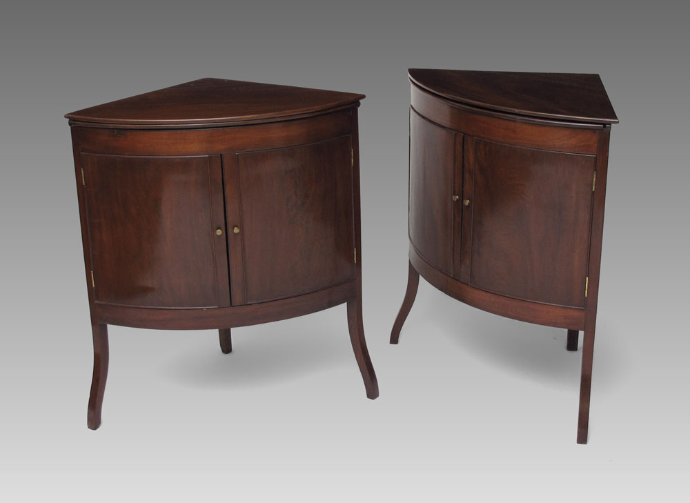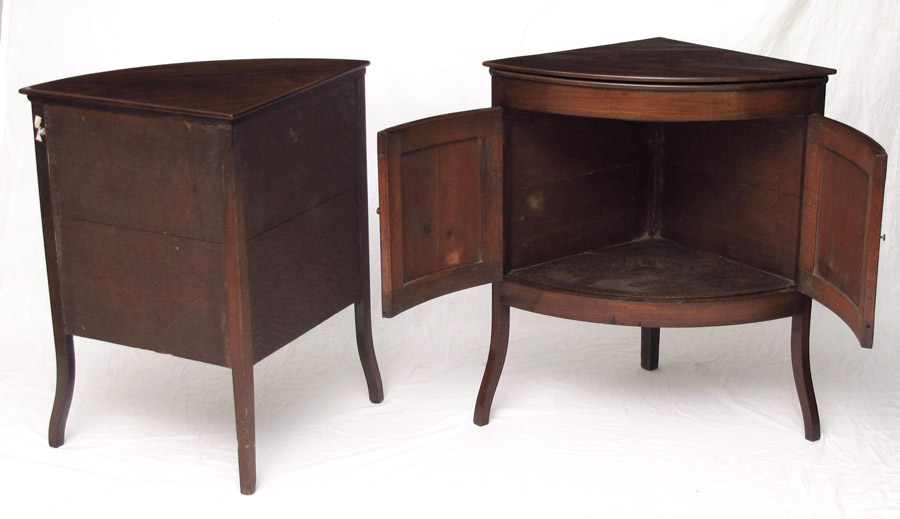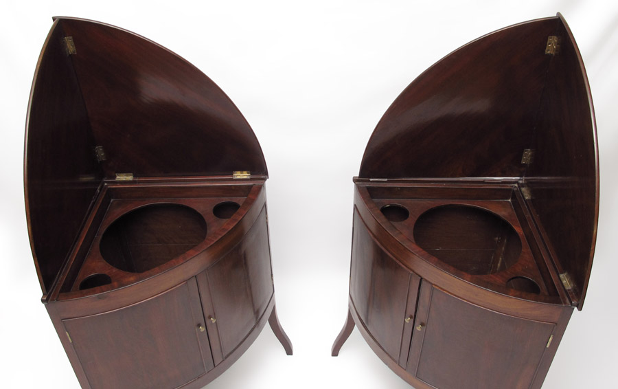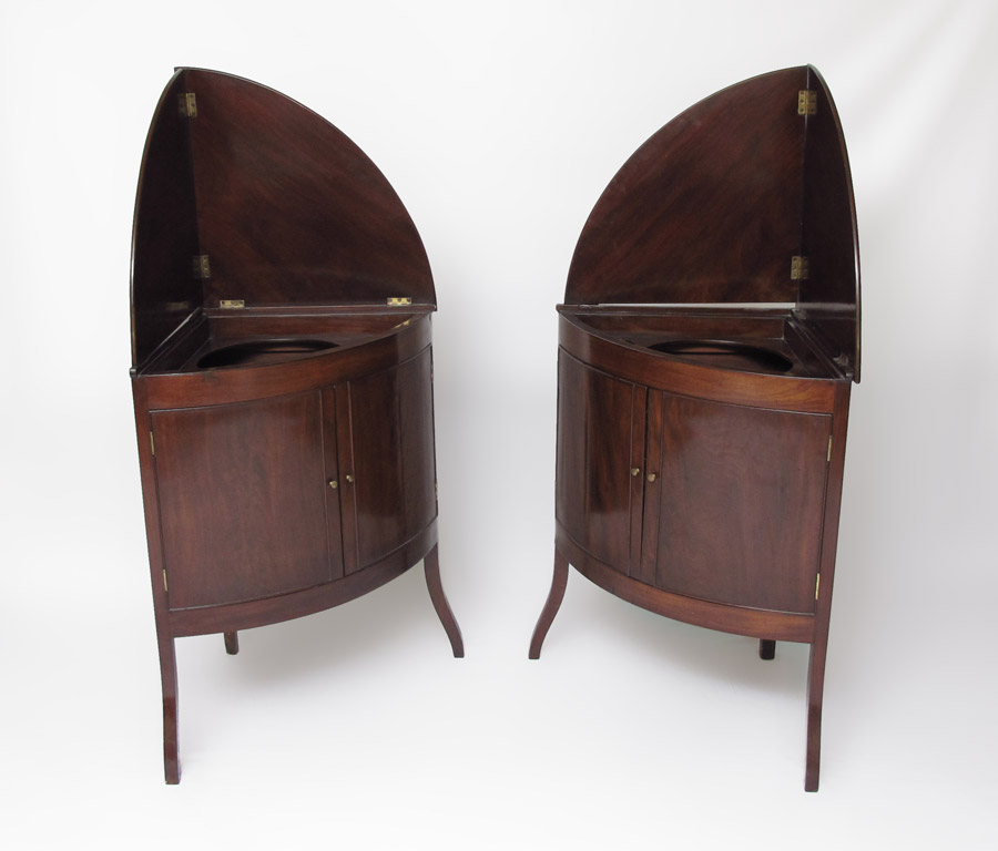 PAIR OF REGENCY MAHOGANY CORNER WASHSTANDS: Hinged lift top converts into backsplash, 3 spaces for porcelain inserts. 2 doors, on shaped front legs. 32 1/2'' h. x 29 1/4'' x 20''.