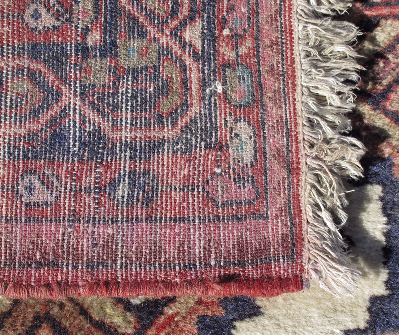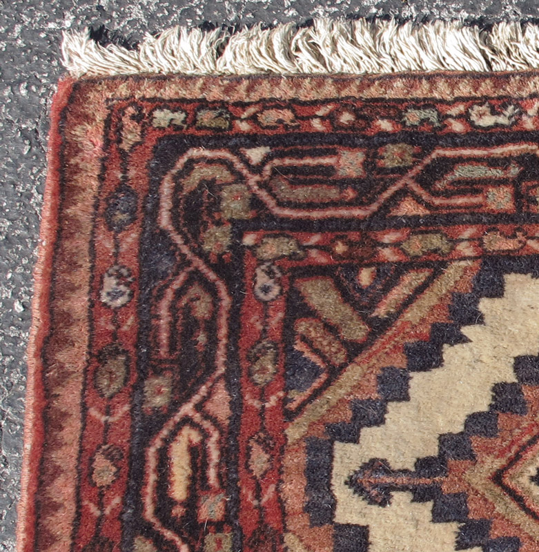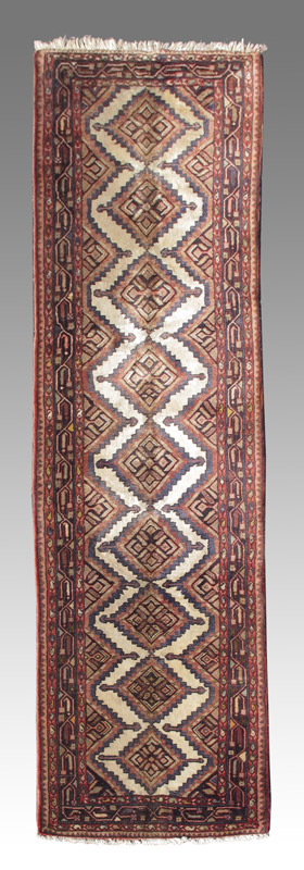 MODERN PERSIAN HAND KNOTTED WOOL RUNNER, 9'7'' x 2'11'': This attractive runner has a geometric design of nine diamond medallions surrounded by an open ivory edge with half diamonds on the sides of the main field. The borders are like those found on Serabend Persian village rugs. Condition is good.