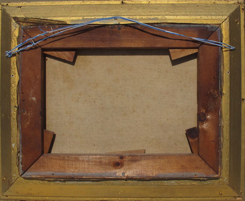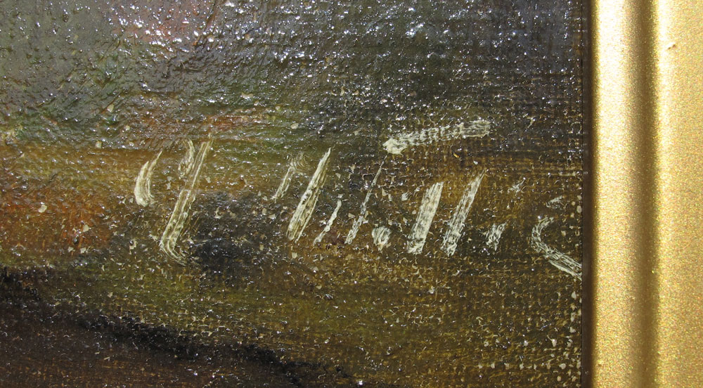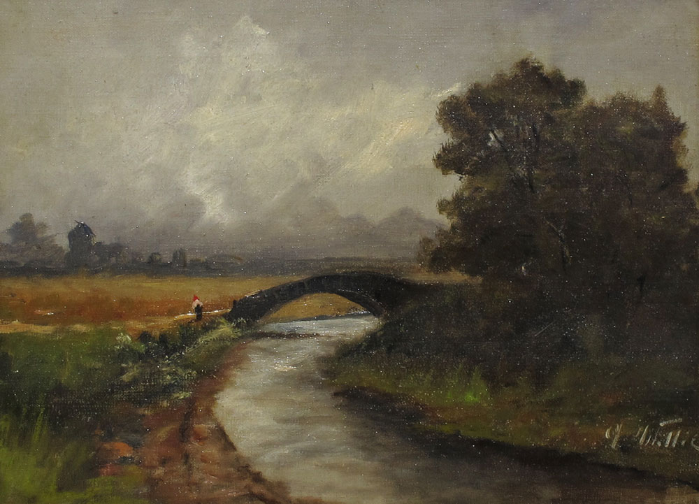 ILLEGIBLY SIGNED EUROPEAN LANDSCAPE WITH CANAL, BRIDGE AND LONE FIGURE WITH TOWN IN THE DISTANCE: OIL/Canvas, 9'' x 12'', gilded frame with wear in need of repair, 14'' x 17''.