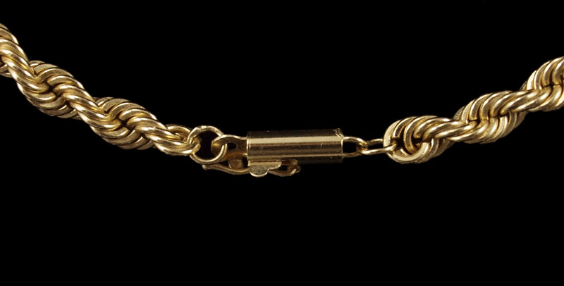 14K GOLD ROPE CHAIN: 14K yellow gold solid rope chain. 4.20 mm in width. 30'' in length. Locking closure with figure eight safety clasp. Weight: 44.3 grams