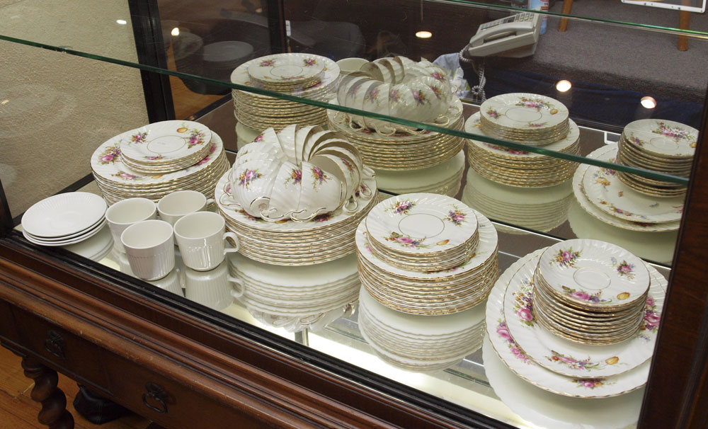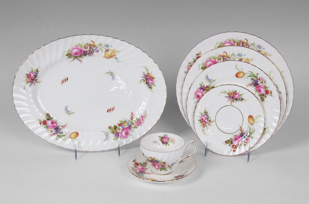 FOLEY DEVONSHIRE BONE CHINA SERVICE FOR 10: Approx. 71 pieces in the Devonshire pattern to include 10 plates (10'' dia.), 12 plates (9 1/4''), 11 salad, 12 bread, 12 cups and 12 saucers, oval platter (13 1/4'' x 10''), oval platter (11 1/4'' x 8 3/4''). Sold with 4 non matching English cups and saucers.
