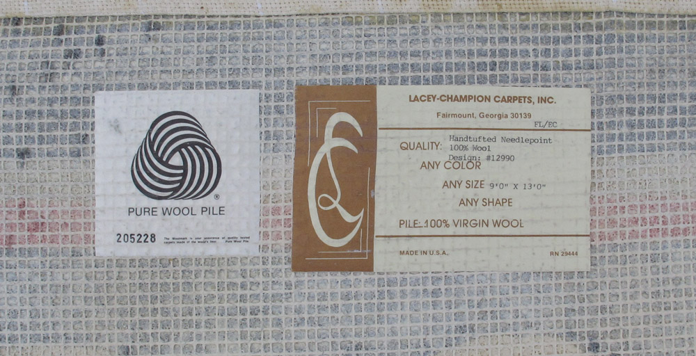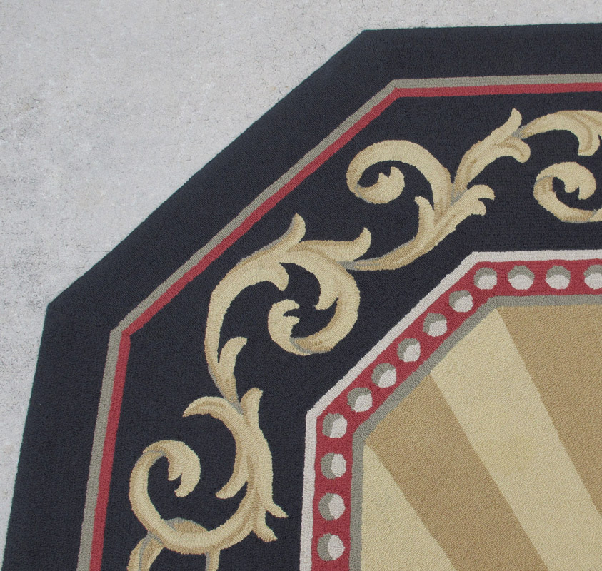 AMERICAN MADE HAND-TUFTED WOOL OCTAGONAL RUG, 9' x 13': Labeled verso ''LACEY - CHAMPION CARPETS INC 100% WOOL HAND TUFTED NEEDLE POINT CARPET 9' x 13' Made in United States of America''. This rug has a central medallion that is black with an ice green center and red edge. Two tones of beige colored rays like sunbeams come out from the center and are bordered by a black main border that has a vine like design. Condition is very good.