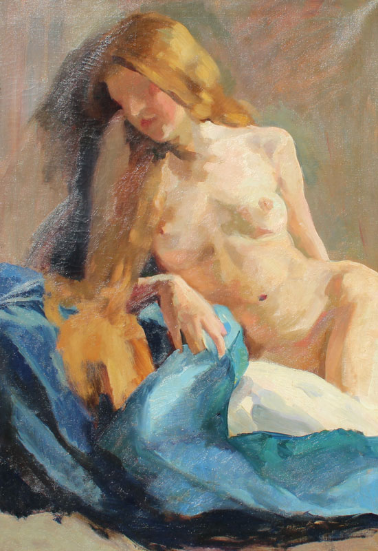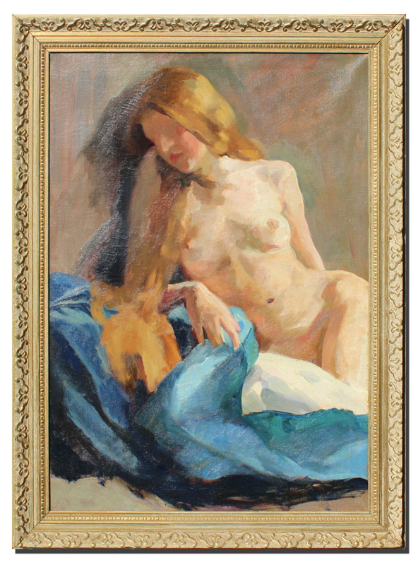 LOUELLA, Fannie, (American, 20th C.): Seated Female nude, OIL/Canvas, 36'' x 26'', signed verso, framed 41 1/2'' x 31 1/2''.
