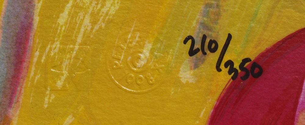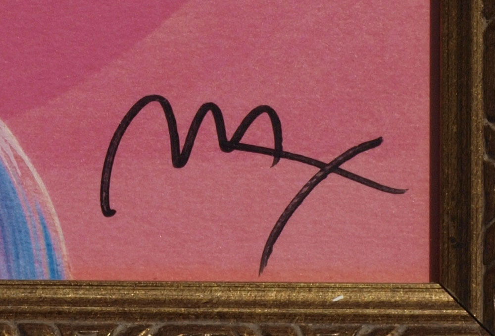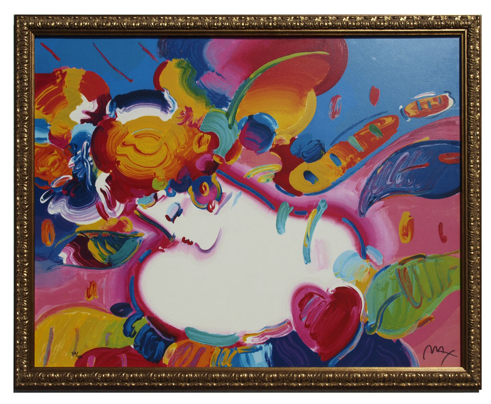 MAX, Peter, (American 20th C): Female face with typical Max style, enhanced Serigraph, sight size 27'' x 36 1/2'', signed lower right, numbered 210/350 lower left, gold carved frame 31'' x 40''.