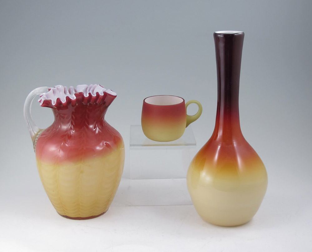 3 PIECE WHEELING PEACH BLOW ART GLASS: 1) Drape pattern pitcher, 7 1/2'' tall. 2) An 11'' bottle neck vase 3) Single matt finish cup, 2 1/2'' tall.