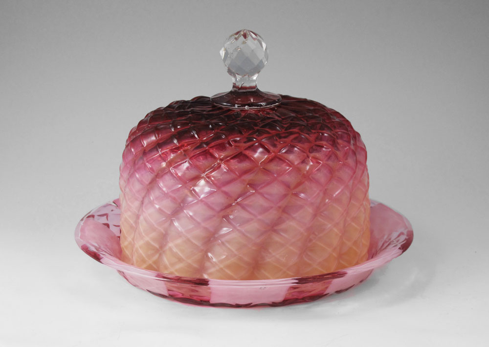 ART GLASS CHEESE DOME AND TRAY: Clear crystal finial with colors graduating from cranberry to peach on dome. 6'' h. x 6 3/4''. Sold with replacement tray 1 1/8'' h. x 9 1/4''.