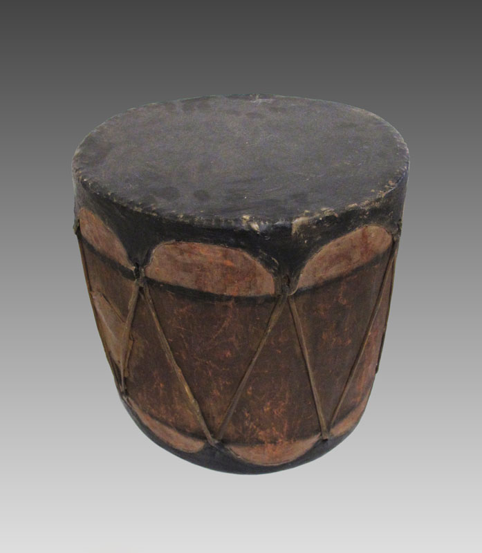 COCHITI PUEBLO PAINTED DRUM: Wood sides with hide heads and sinew stretchers and handle. Remnants of white painted border with black rings. Early repair on side of drum. 12 1/4'' h. x 12'' dia.