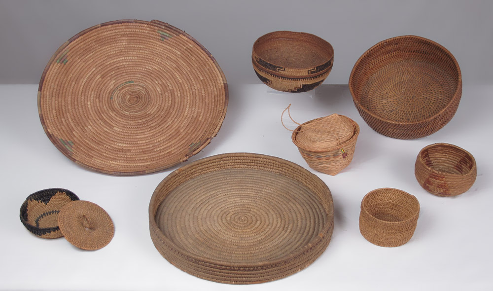COLLECTION OF 8 NATIVE AMERICAN WOVEN BASKETS: An assembled collection including Southwest, California, Northwest, and Cherokee baskets of assorted shapes, sizes, and patterns. Largest flat basket measures 17'' dia.