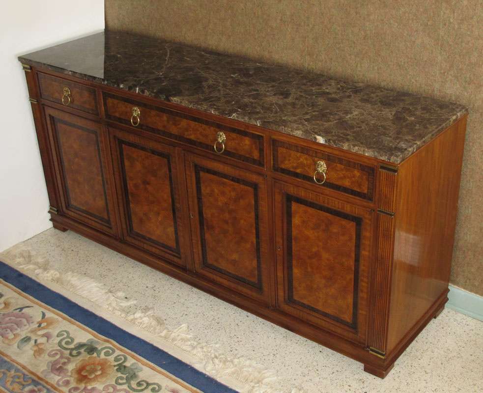 DREXEL HERITAGE MARBLE TOP SIDEBOARD: Brown variegated marble top over 2 quarter length drawers with center half length drawer, over 4 doors. Center drawer lined for silver. 32 1/4'' x 68 3/4'' x 19''.