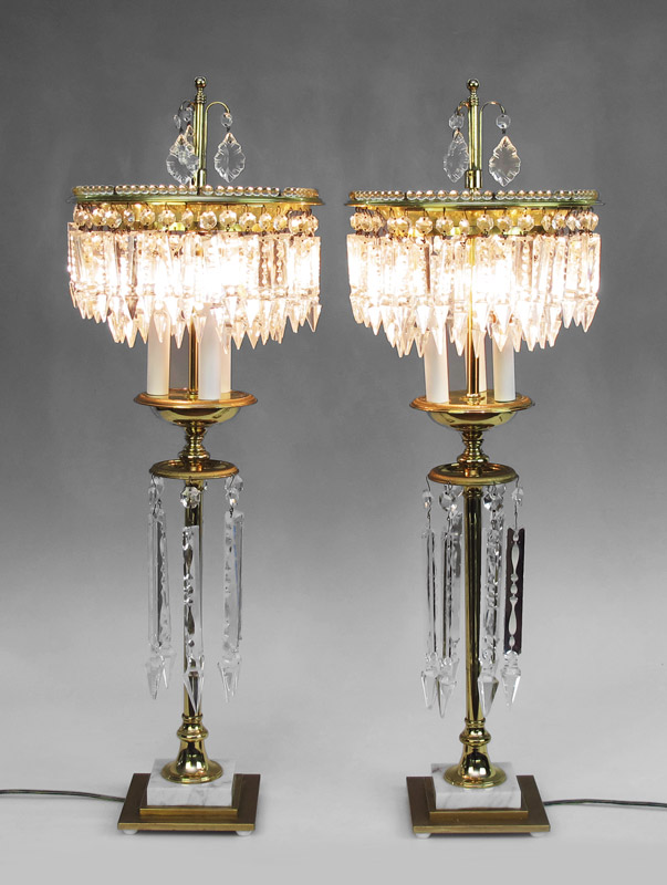 PAIR OF BRASS AND CRYSTAL BANQUET LAMPS: Tall brass lamps with the shade having a double row of crystal prisms and framed in glass beads. The lower prisms are a grand 8 1/2''l. Italian marble bases. Approx. 31'' tall, the shade diameter is 10''.