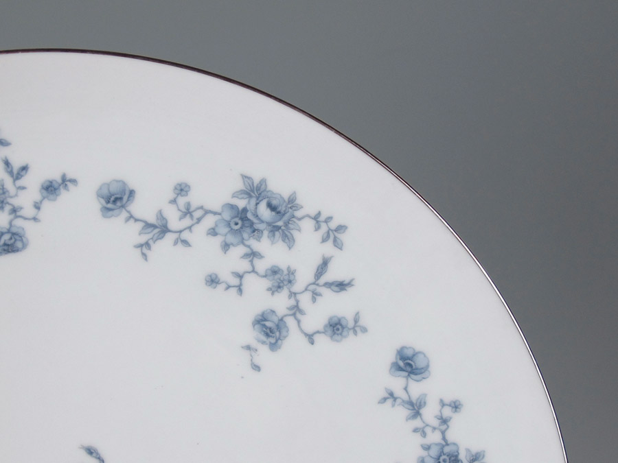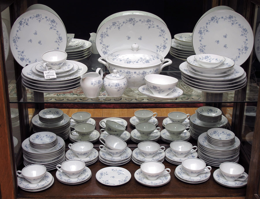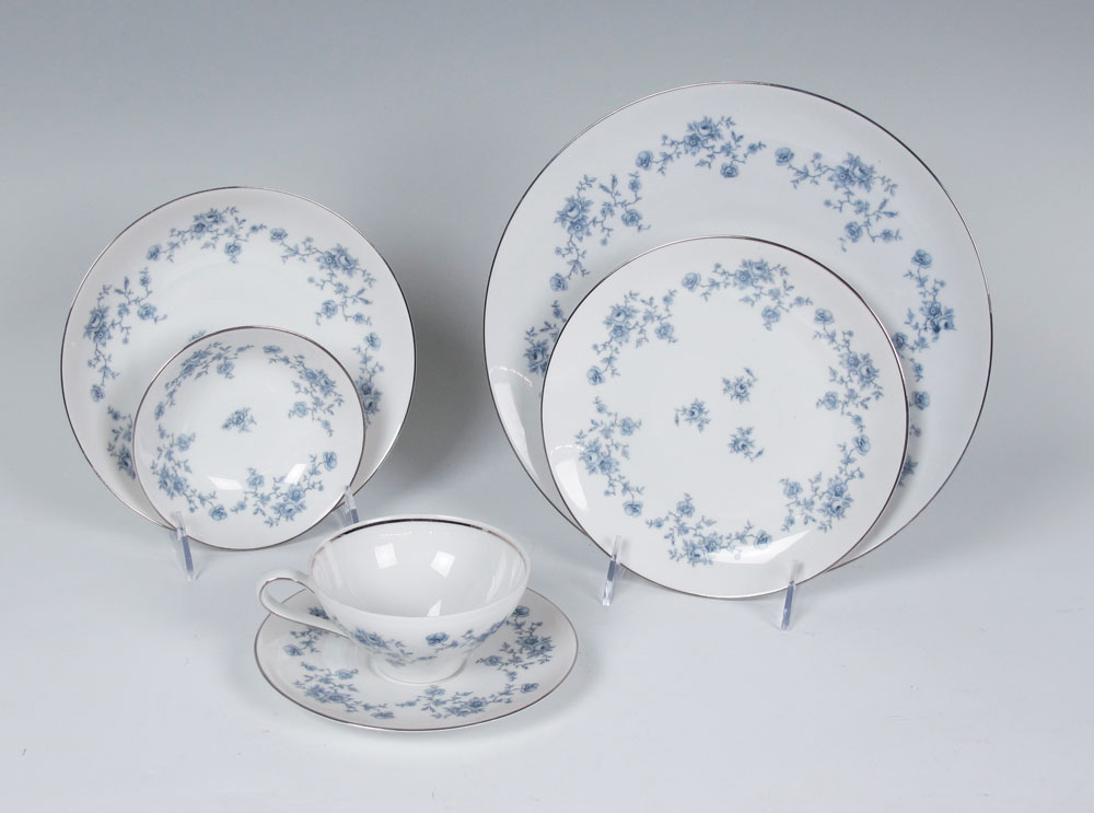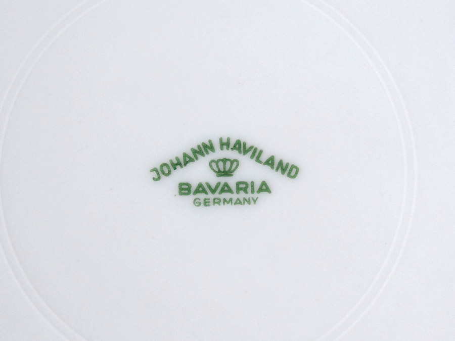 JOHANN HAVILAND BLUE GARLAND CHINA SERVICE: Approx. 73 pieces in the Blue Garland pattern by Johan HAviland, Bavaria to include 12 plates (10 1/4''), 12 salad plates, 11 coupe soup bowls, 12 dessert bowls, 11 cups and 10 saucers, covered tureen (7'' h. x 12 1/2''), oval platter (13'' x 7''), sauce boat (3'' h. x 7''), open creamer, covered sugar.
