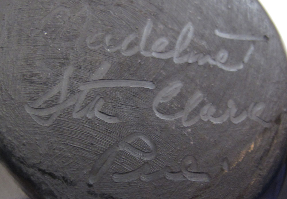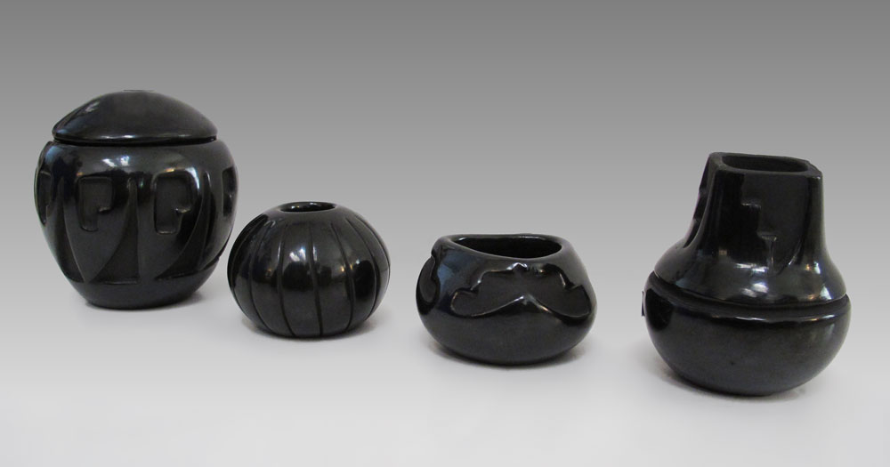 4 PIECE SANTA CLARA BLACK POTTERY: To include 1) Madeline Tofoya carved vase, signed Madeline T., 4 1/4'' h. 2) Madeline Tafoya carved bowl, signed Madeline T., 4 1/8'' h. x 5''. 3) Ramona Sisneros carved bowl, signed 2 1/2'' h. 4) Ramona Sisneros ribbed pot, signed, 2 3/4'' h.