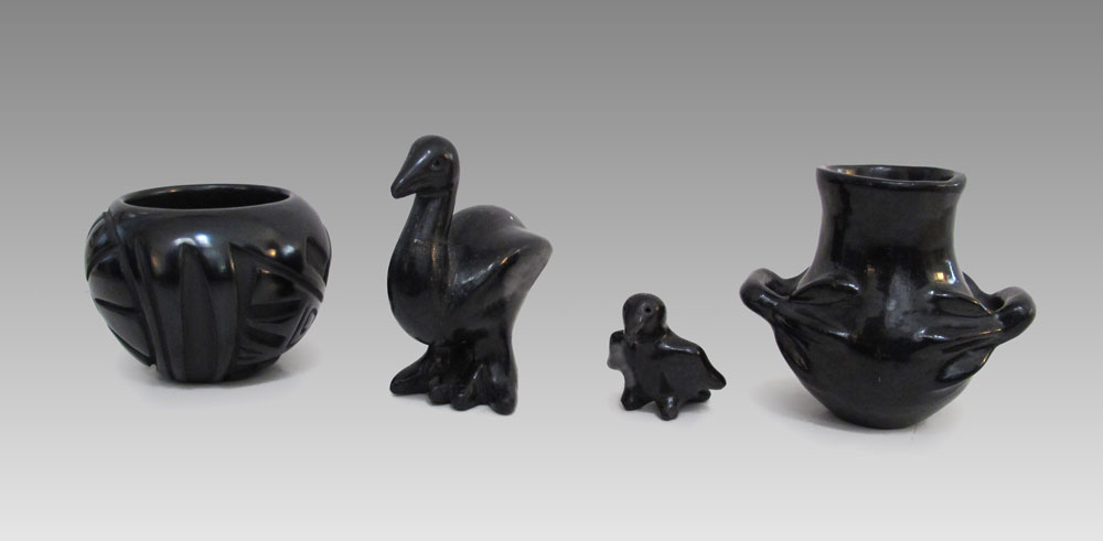 4 PIECE SANTA CLARA BLACK POTTERY: To include 1) Julia Martinez carved bowl with sun and bird motif, signed, 3 1/2'' h. x 4 3/4''. 2) Unsigned handled pot, 4 1/2'' h. x 5''. 3) Unsigned bird effigy, 4 7/8'' h. x 4 1/4''. 4) Smaller bird effigy, unsigned, 2 3/8'' h.