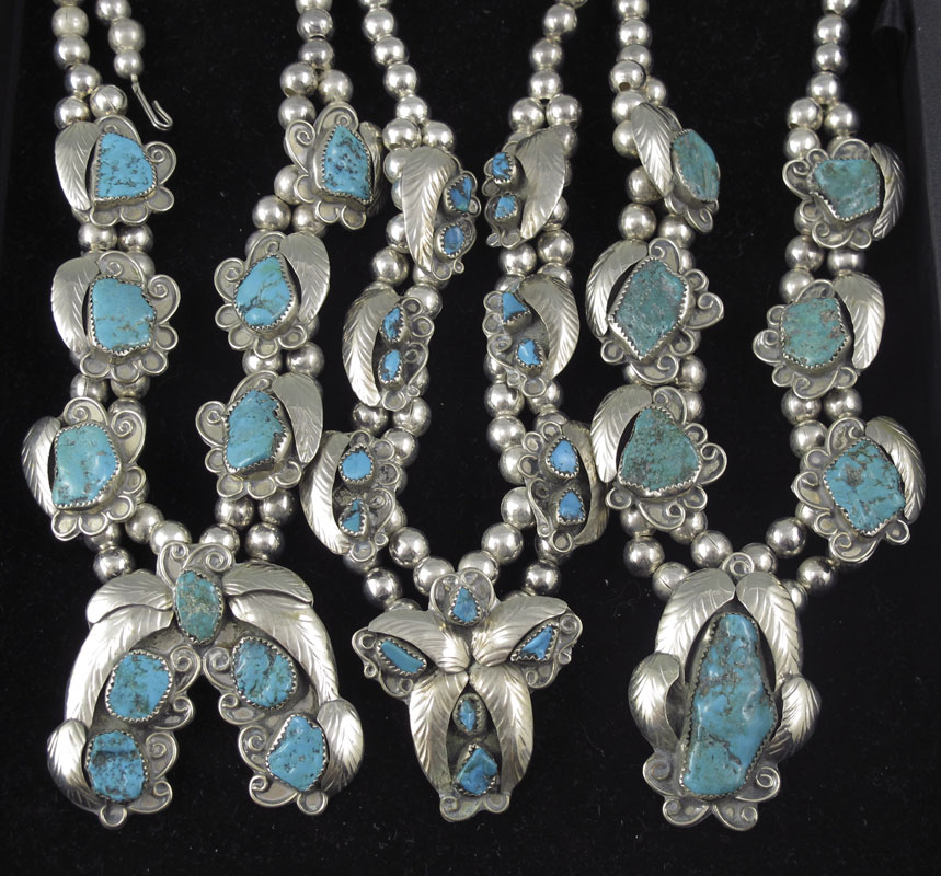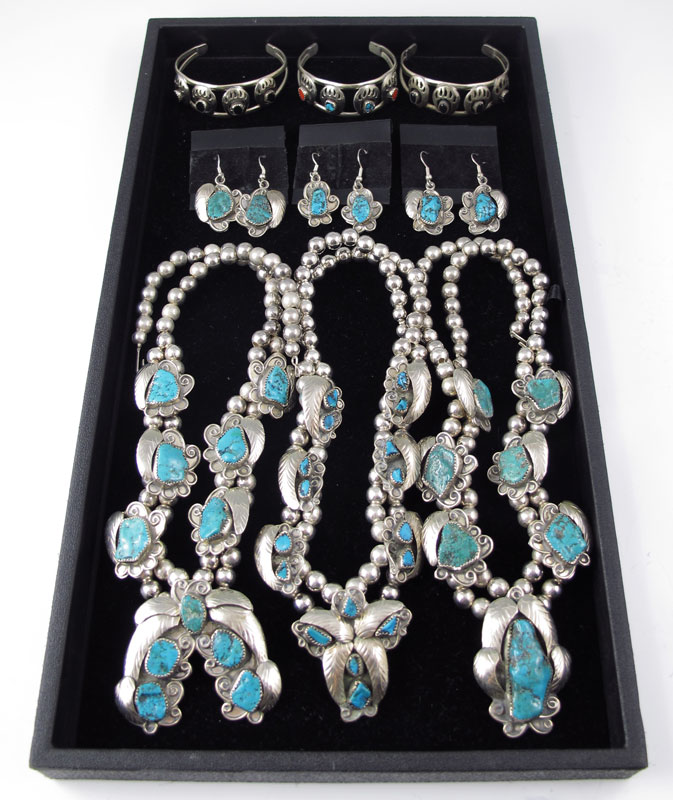 ESTATE COLLECTION OF NATIVE AMERICAN JEWELRY: 9 pieces to include, three squash blossom necklaces all set with turquoise, 6 blossoms and central naja to each, between 18'' and 20''; three pair of drop earrings on shepherd hook findings; three bear paw decorated cuff bracelets, two set with onyx one with turquoise and coral. All but one cuff marked L T.