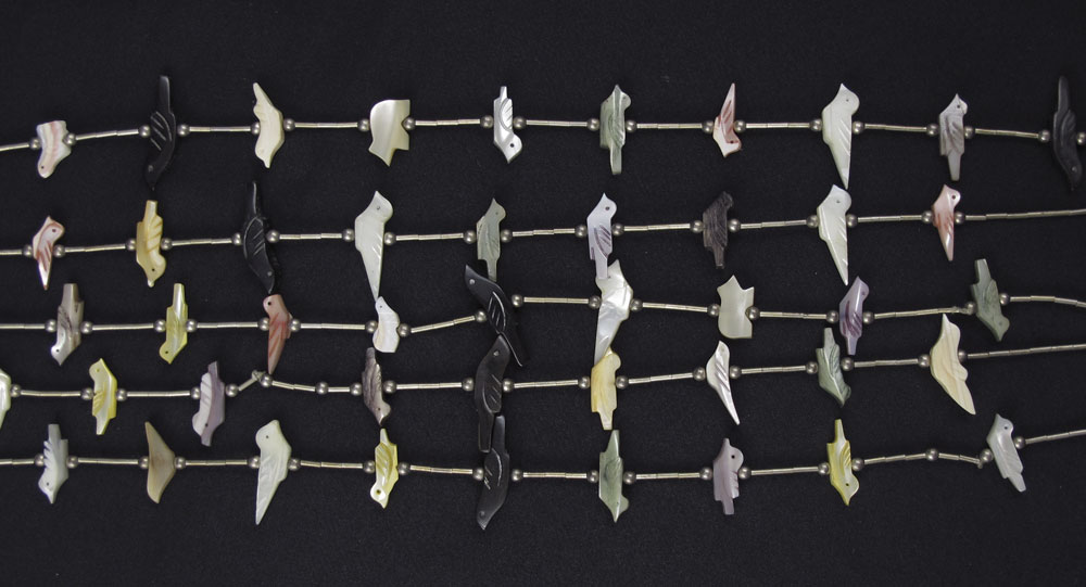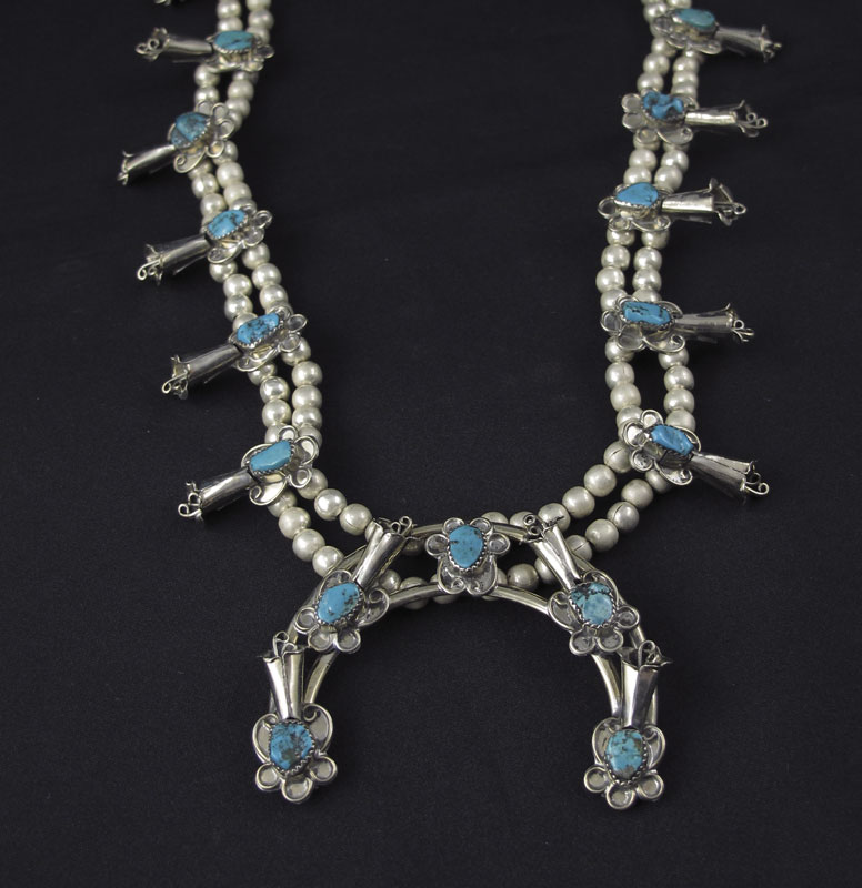 THREE NATIVE AMERICAN INDIAN SILVER NECKLACES: 1) Sterling squash blossom necklace signed I H, ten blossoms and 2'' naja with central dangle, set with turquoise, approx. 22''l.; 2) Squash blossom necklace signed L T, twelve blossoms and a 2 1/2'' x 3'' naja, all set with turquoise, approx. 28''l.; 3) Five strand fetish necklace, mostly birds, silver round and tube beads, hook and eye closure, no mark found, approx. 23''.