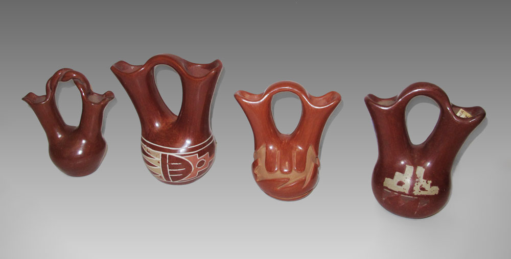 4 PIECE SANTA CLARA POTTERY RED WEDDING VASES: To include 1) Madeline Tafoya carved wedding vase with design of the serpent, signed Madeline T. St Clara Pue. 2) Lucaria painted wedding vase with geometric design, signed Lucaria Sta Clara, 7 1/2'' h. x 6 1/4''. 3) Unsigned painted wedding vase with geometric design, 7'' h. x 5 3/4''. 4) Unsigned and undecorated wedding vase with twist handle, 6 3/4'' h. x 5 1/4''.