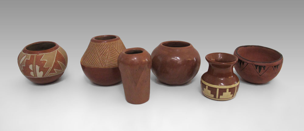 5 PIECE SANTA CLARA POTTERY RED BOWLS & VASE: To include 1) Madeline Naranjo ribbed bowl, signed Madeline Naranjo Santa Clara, 3 1/2'' h. x 4 1/4''. 2) Montoya incised pot, signed ??? Montoya, 4'' h. 3) Severa Tafoya carved vase, signed Severa, 4'' h. x 2 1/2'' dia. 4) Unsigned incised and painted bowl, 3 3/8'' h. x 4 1/2'' dia. 5) Unsigned painted bowl, 2 3/4'' h. x 4 1/4''. Sold with 6) B. Talbot, Pinridge Sioux pot with applied decoration, 3 1/8'' h.