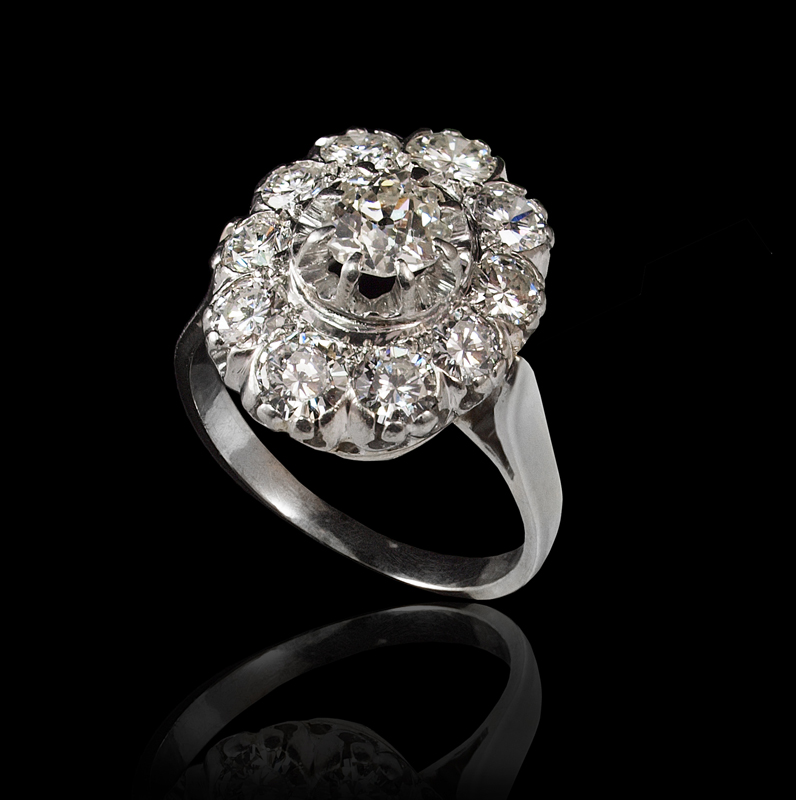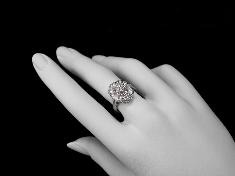 FRENCH PLATINUM 2.10 CTW DIAMOND RING: Centering an early European round cut diamond of approx. .60 Ct. Framed by an additional 10 round brilliant cut diamonds totaling 1.5 Ct. TOTAL diamond weight 2.10 Ct. Averaging VS1 in clarity and G color. French hallmarks. Size 5.5. Weight 5.8 grams. Sold with current Florida Diamond Appraisers GIA graduates appraisal for $10,200.