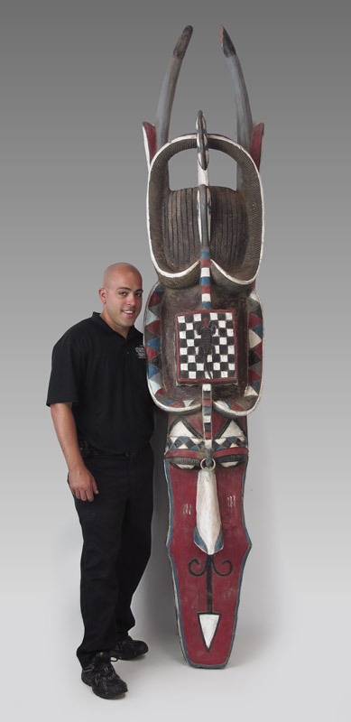 LARGE AFRICAN CARVED BAGA NALU MASK: Decorated with cowry shells. 112'' x 20'' x 16''.