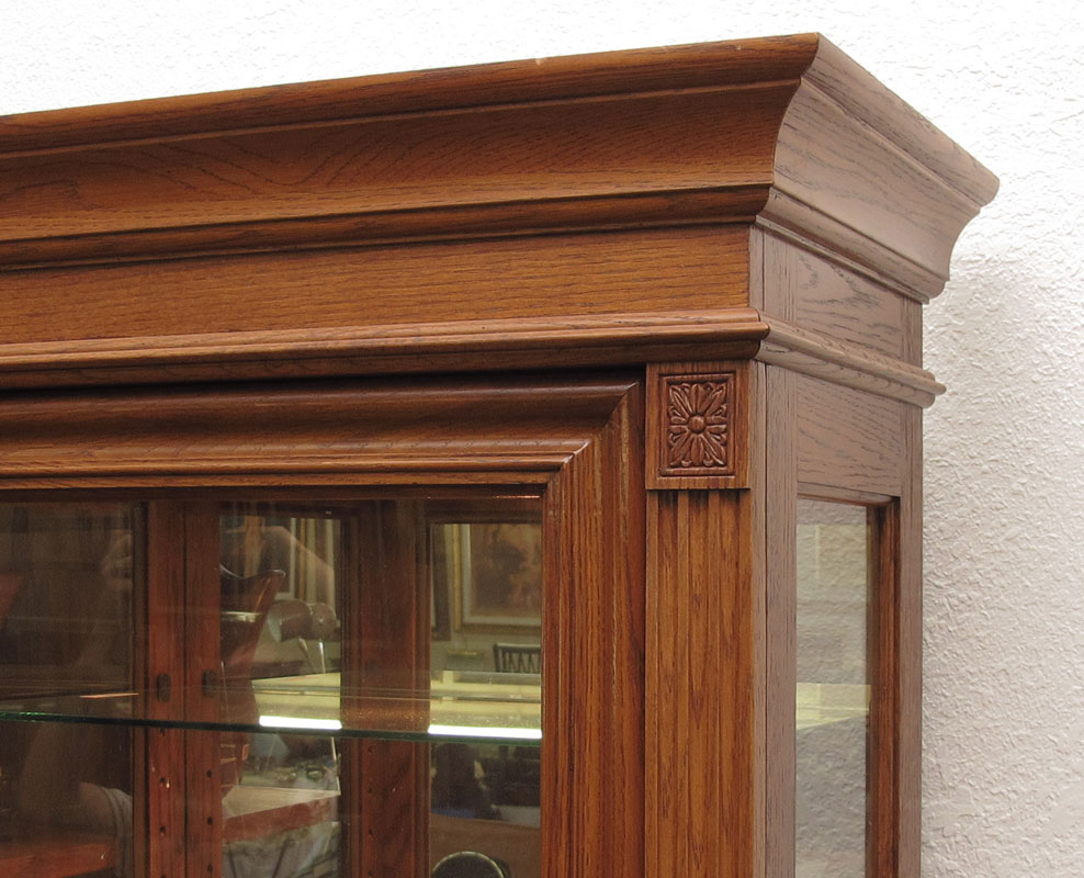 MODERN OAK ILLUMINATED CURIO DISPLAY BOOKHELF CABINET: Left side open with 5 adjustable wood shelves. Right side illuminated with mirrored back, 5 adjustable glass shelves and sliding front door. 80 1/2'' h. x 44'' x 14''.