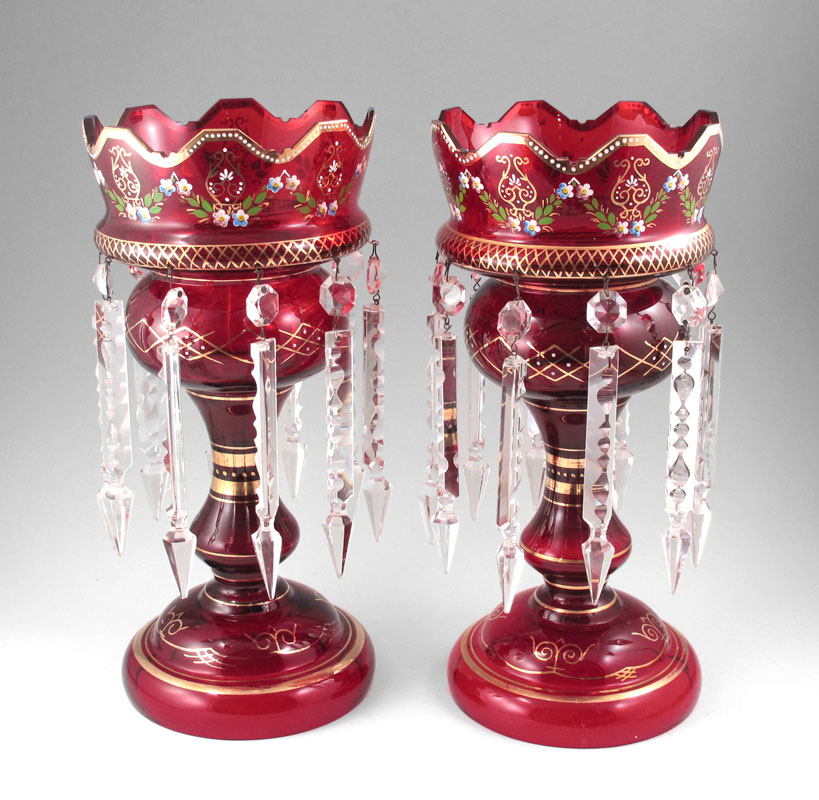 PAIR OF RUBY GLASS LUSTERS WITH CRYSTAL PRISMS: Hand painted floral and gilt decoration. 13 3/4'' x 6 1/4''.
